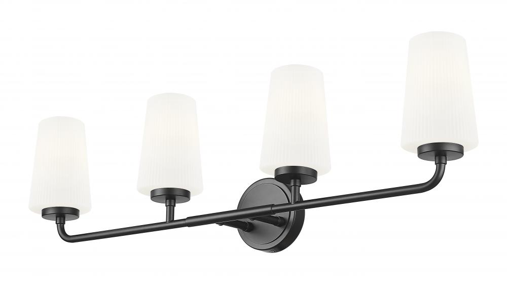 Enhance an inviting primary of guest bath with this modern four-light vanity wall light. Featuring clean curves, its highlighted with a matte black finish that offers maximum contrast in virtually any wall space. Gently ribbed opal glass shades are tall and tapering, and this fixture allows for installation with lights up or down to best suit your space and taste.