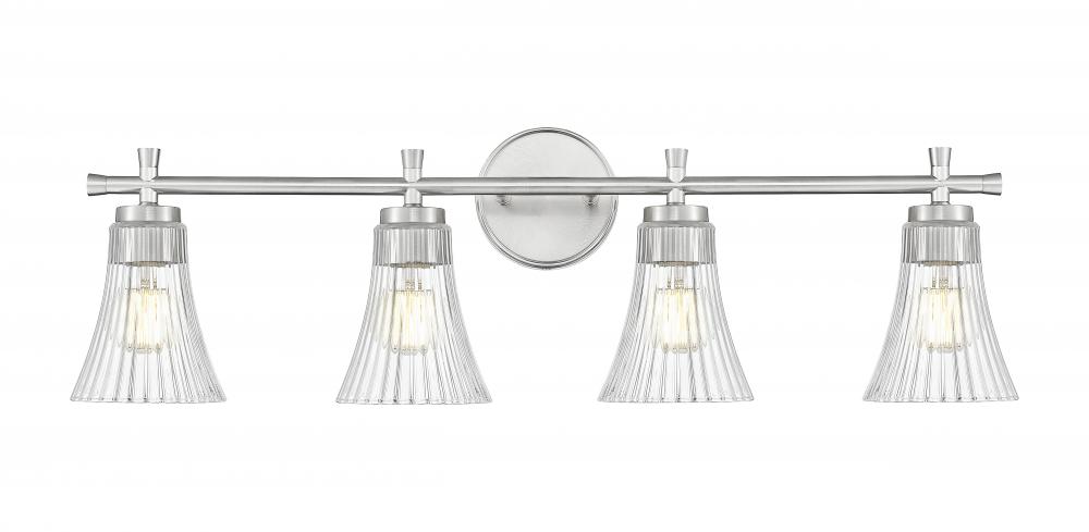 Cool and composed in a brushed nickel finish, this four-light vanity fixture radiates refinement. Each fluted clear glass shade glistens softly, like water frozen mid-motion, so its light, fluid, and full of dimension. It?s the kind of piece that quietly enhances everything around it.