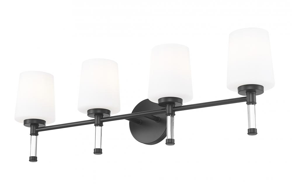 For a bold statement, this matte black four-light vanity light stretches across the mirror like a tailored line, grounding lighter finishes and adding depth to the room. Crystal accents and white shades keep the composition from feeling heavy, allowing the light to spill gently across countertops while still reaching every part of a larger vanity. Whether paired with warm wood, concrete, or glossy tile, this confident fixture gives the space a gallery-like presence that feels both modern and welcoming.