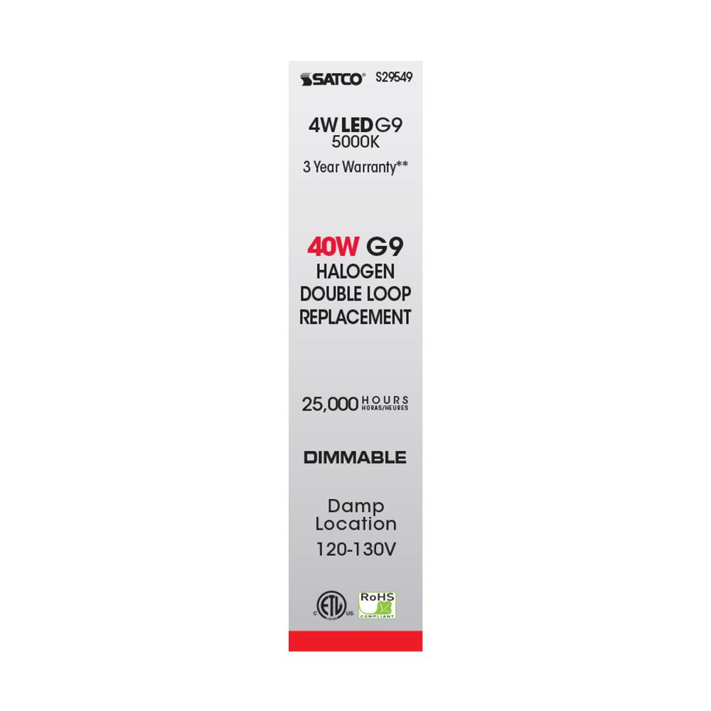 Satco's S29549 4 watt JCD G9 base bulb is shaped to fit into tight spaces without drawing too much energy. The clear, miniature LED bulb features a bi pin G9 base with a 360 degree beam spread. With a temperature of 3000 kelvins, this lamp provides 25,