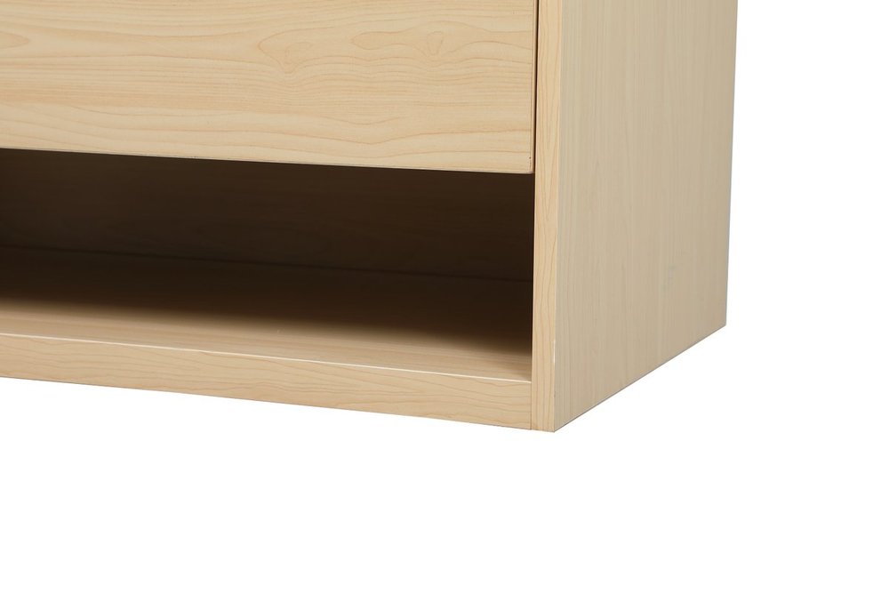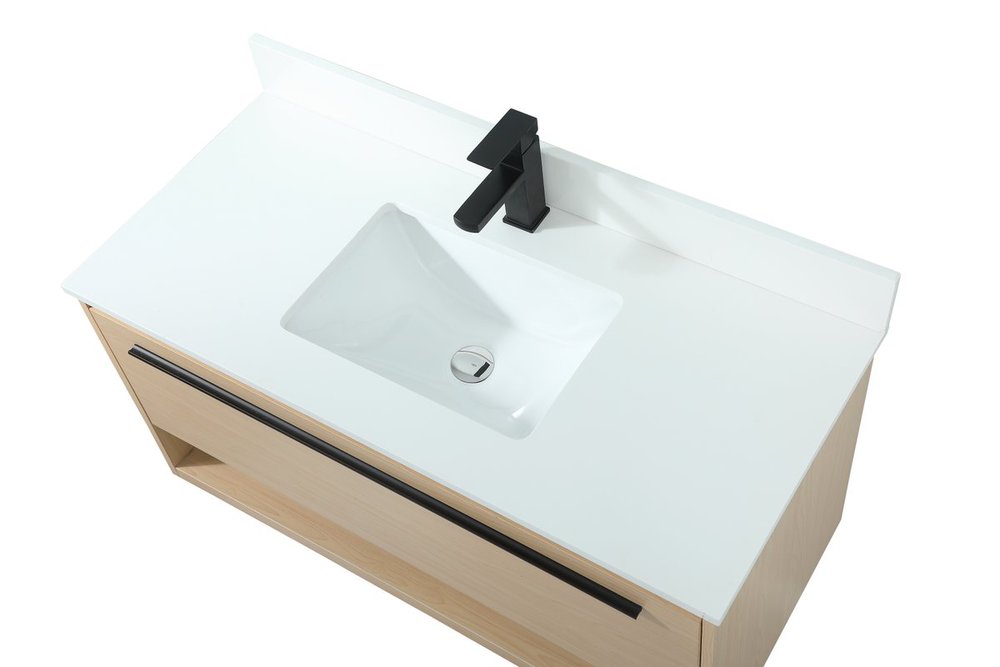 Save space and make your bathroom appear bigger with this floating vanity. Its minimal design will have you in awe, while its clean lines will leave your room feeling fresh and uncluttered. The Single u-drawer pulls out for storage while the open space below allows you to place extra towels or various other essentials. The ivory white engineered marble counter top with porcelain sink adds refined luxe while the aluminum barpull style handle adorn the vanity face. Comes with a matching backsplash to protect your walls.