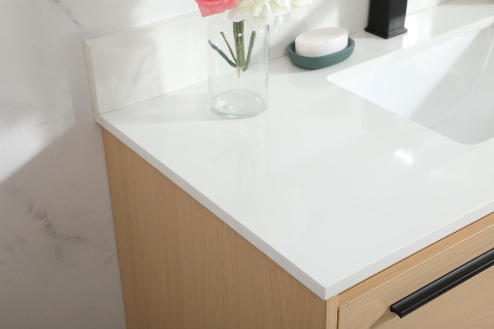 Comes with an undermount porcelain sink and a durable ivory white engineered marble stone top