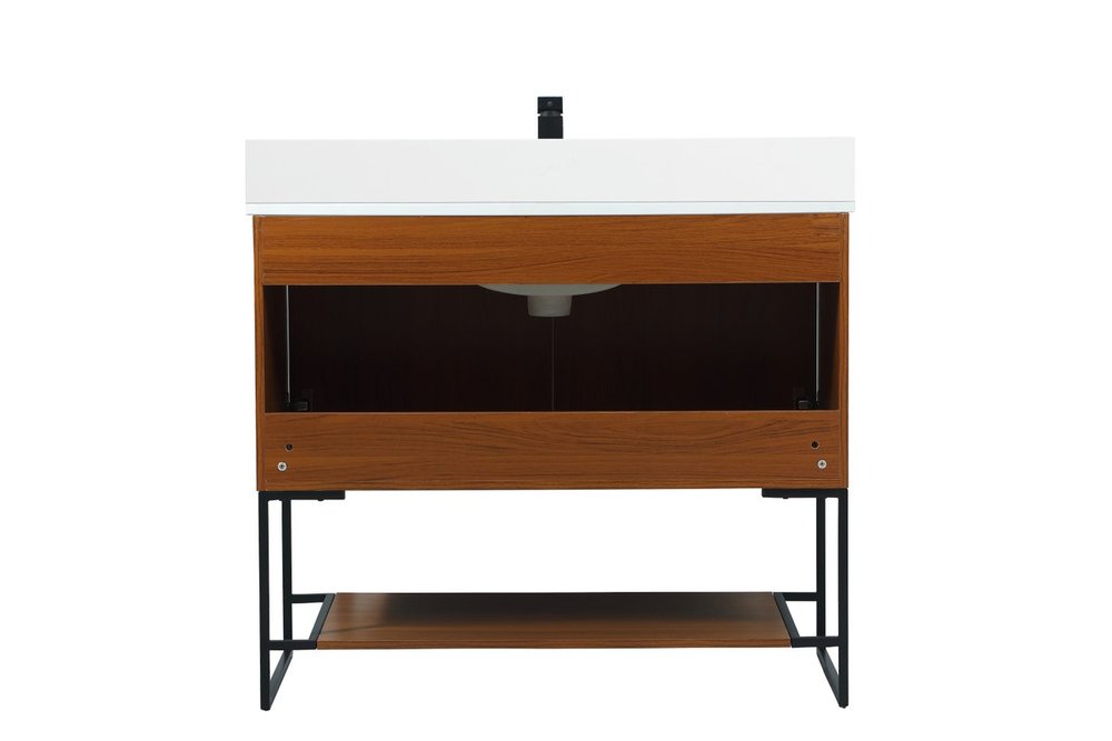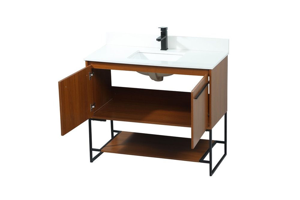 Live in modern comfort with this 40" teak finish vanity. Dressed in a teak and sleek black metal hardware, its contemporary style will have your bathroom or powder room elevated in industrial sophistication. The open shelf at the base and two doors reveal ample storage space for your bathroom essentials and miscellany. Clean lines create its own visual interest, adding trendy looks to your already chic room. Comes with a matching backsplash to complete the look and protects your wall.