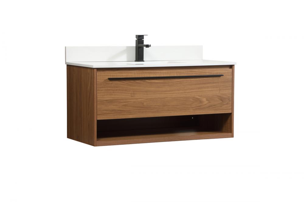 Save space and make your bathroom appear bigger with this floating vanity. Its minimal design will have you in awe, while its clean lines will leave your room feeling fresh and uncluttered. The Single u-drawer pulls out for storage while the open space below allows you to place extra towels or various other essentials. The ivory white engineered marble counter top with porcelain sink adds refined luxe while the aluminum barpull style handle adorn the vanity face. Comes with a matching backsplash to complete the look and protects your wall.