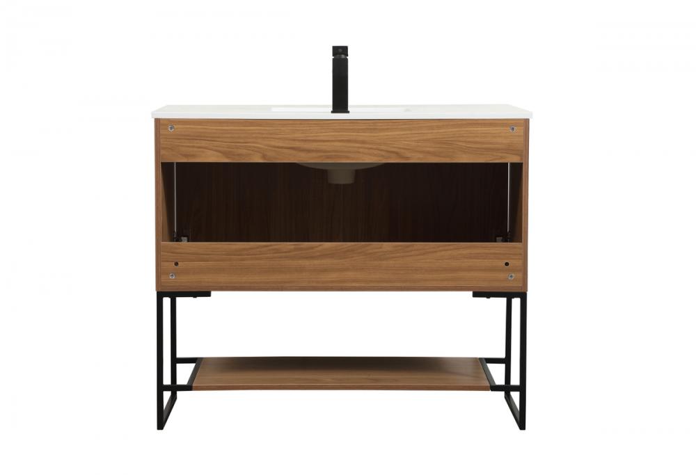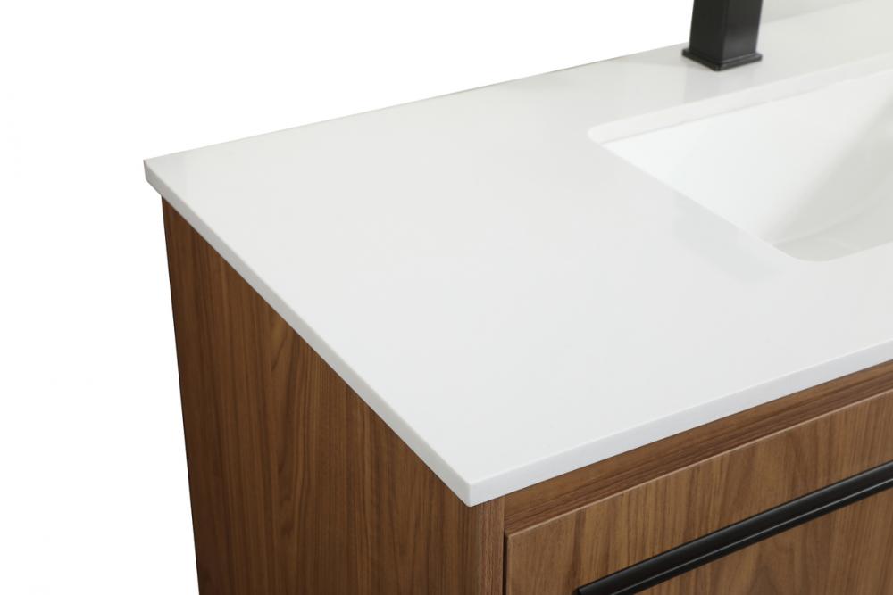 Live in comfort with this modern vanity. Dressed in a walnut brown and modern black metal hardware, its sleek style will have your bathroom or powder room elevated in industrial sophistication. The open shelf at the base and two doors reveal ample storage space for your bathroom essentials. Clean lines create its own visual interest, adding trendy looks to your already chic room.
