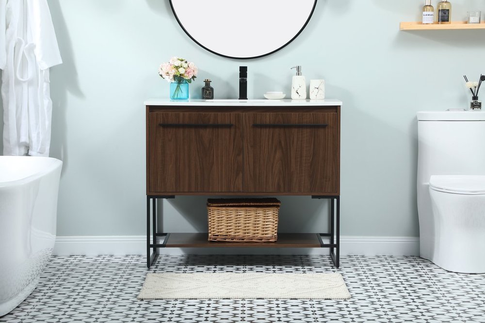 Live in modern comfort with this 40" walnut finish vanity. Dressed in a walnut and sleek black metal hardware, its contemporary style will have your bathroom or powder room elevated in industrial sophistication. The open shelf at the base and two doors reveal ample storage space for your bathroom essentials and miscellany. Clean lines create its own visual interest, adding trendy looks to your already chic room.