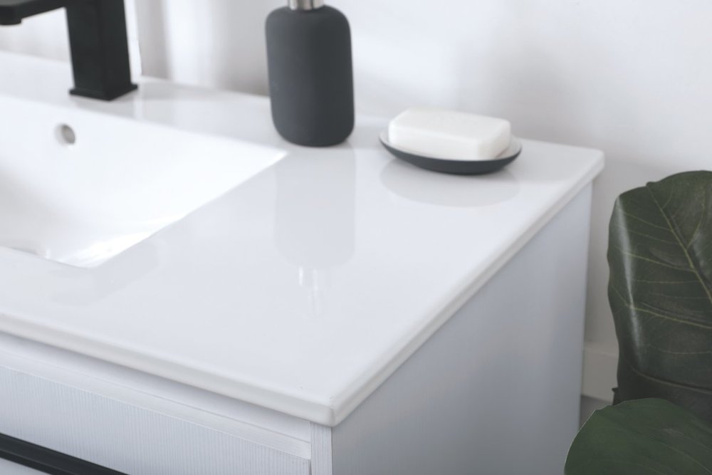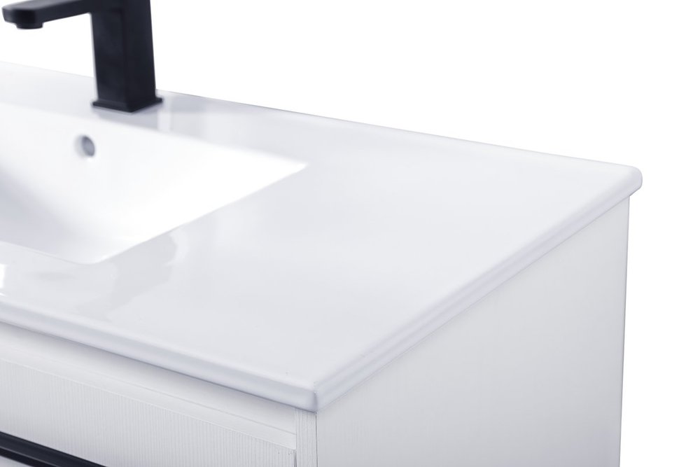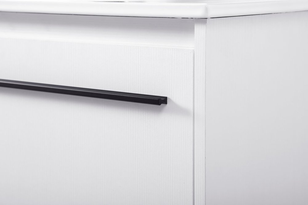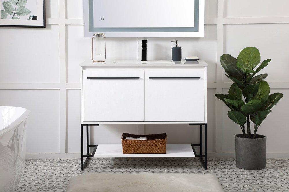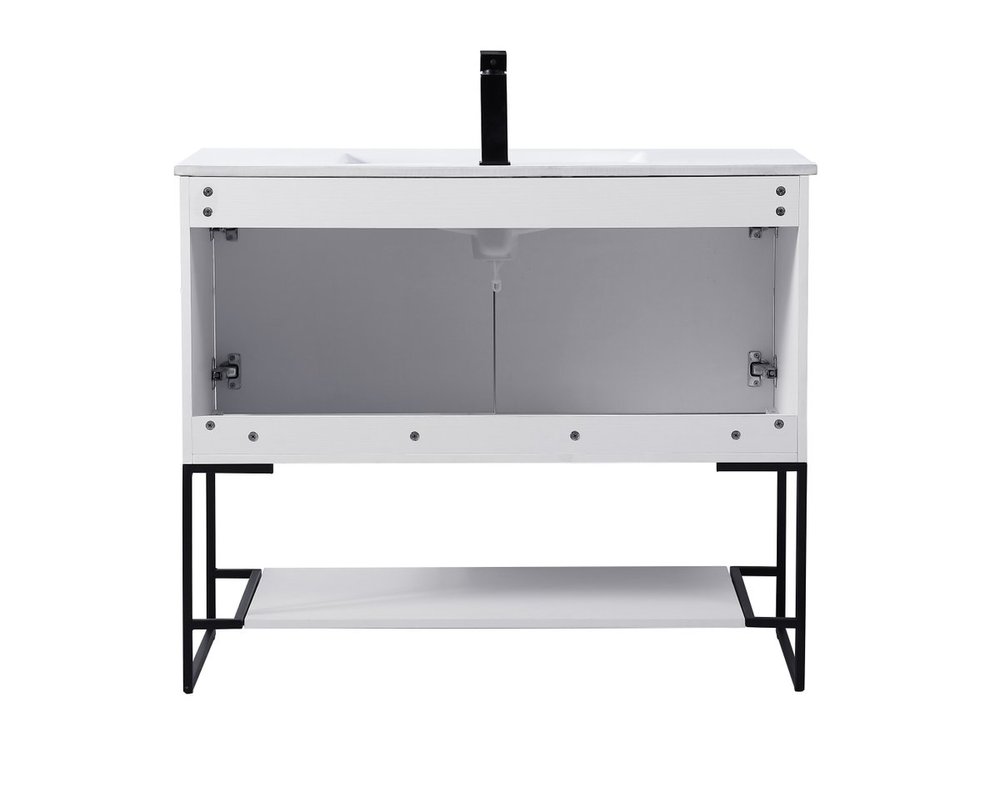 Live in modern comfort with this 40" white finish vanity. Dressed in a concrete grey and sleek black metal hardware, its contemporary style will have your bathroom or powder room elevated in industrial sophistication. The open shelf at the base and two doors reveal ample storage space for your bathroom essentials and miscellany. Clean lines create its own visual interest, adding trendy looks to your already chic room.