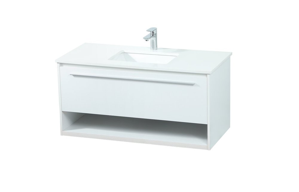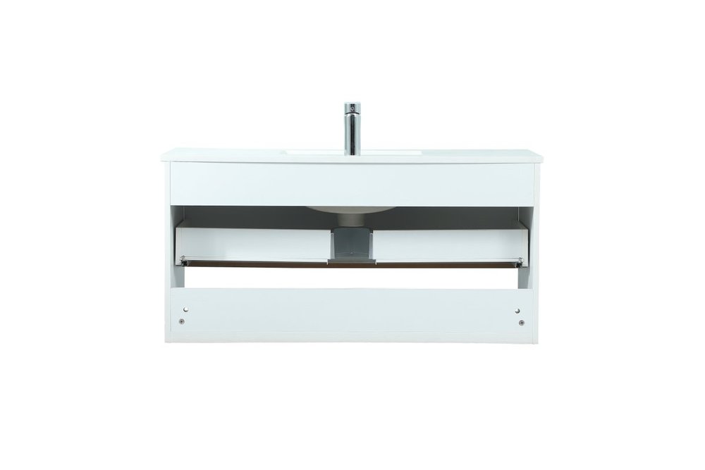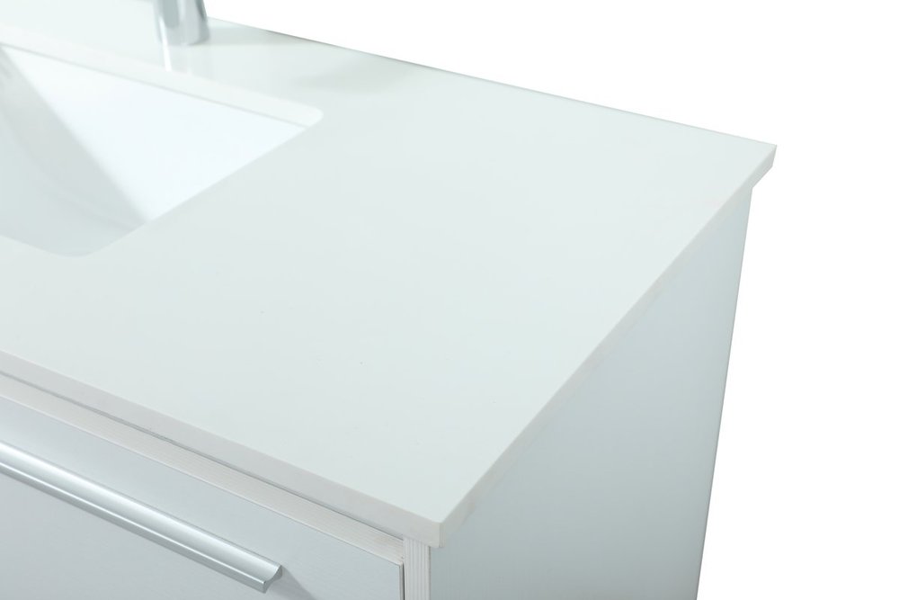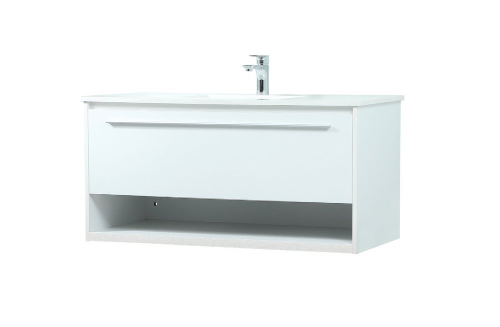 Save space and make your bathroom appear bigger with this floating vanity. Its minimal design will have you in awe, while its clean lines will leave your room feeling fresh and uncluttered. The Single u-drawer pulls out for storage while the open space below allows you to place extra towels or various other essentials. The ivory white engineered marble counter top with porcelain sink adds refined luxe while the aluminum barpull style handle adorn the vanity face.