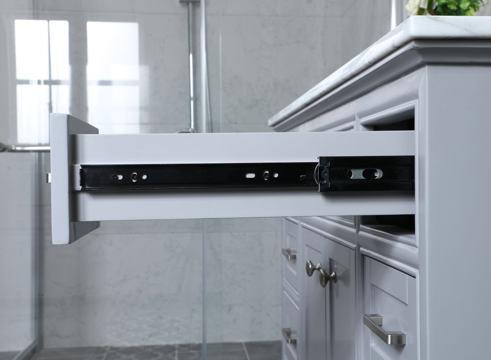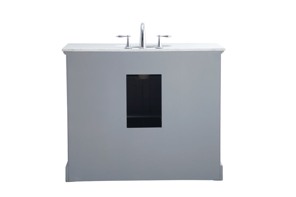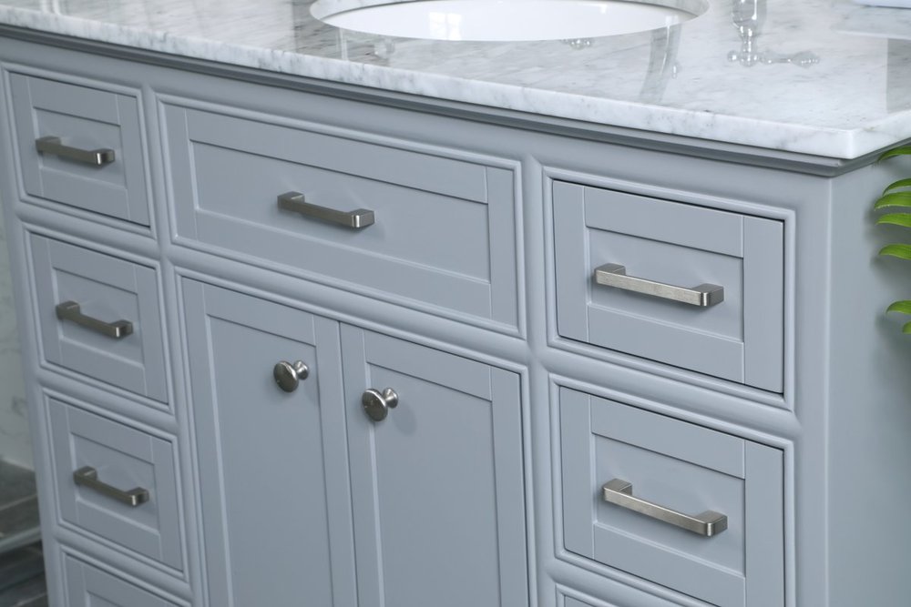 From its Italian Carrara white marble top to its contemporary-styled hand painted soft grey cabinet, it is sure to enhance either your home or office bathroom. Beneath its lustrous, natural marble top and an oval, white porcelain under mount sink, is a cabinet with 3 handsome drawers on each side and 2 center doors with a Single shelf for all your bathroom essentials, highlighted with recessed panel doors, brushed steel bar handle and knobs, stands on strong solid pedestal feet. A wonderful balance of simplicity and practical function! Measurements: W42”xD21.5”xH35”