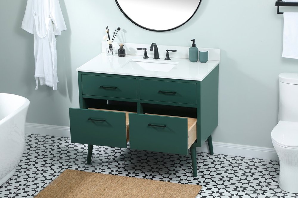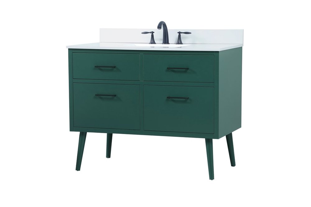 Delve into a world of minimalistic fashion and contemporary styling with this midcentury modern 42" vanity. The clean lines anchors the design, while the oblique tapered cylinder legs add subtle interest. However, the artful juxtaposition between the blue and white top creates a blend of bright modernity and classical traditions. A gold handle adorns the top fake drawer hiding the base of the undermount porcelain sink while another one allows you to pull the bottom drawer out, letting you store your bathroom necessities and toiletries. The compact size makes it the perfect vanity for any bathroom or powder room, regardless of size. Comes with a matching backsplash to complete the look and protects your wall.