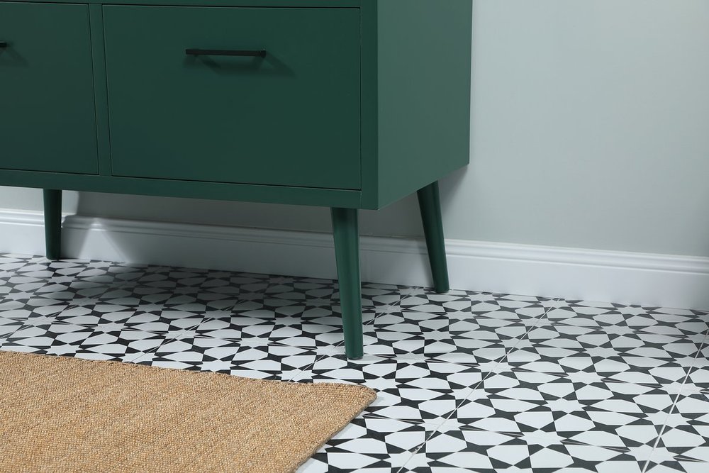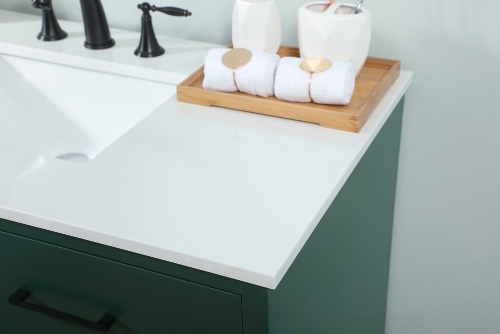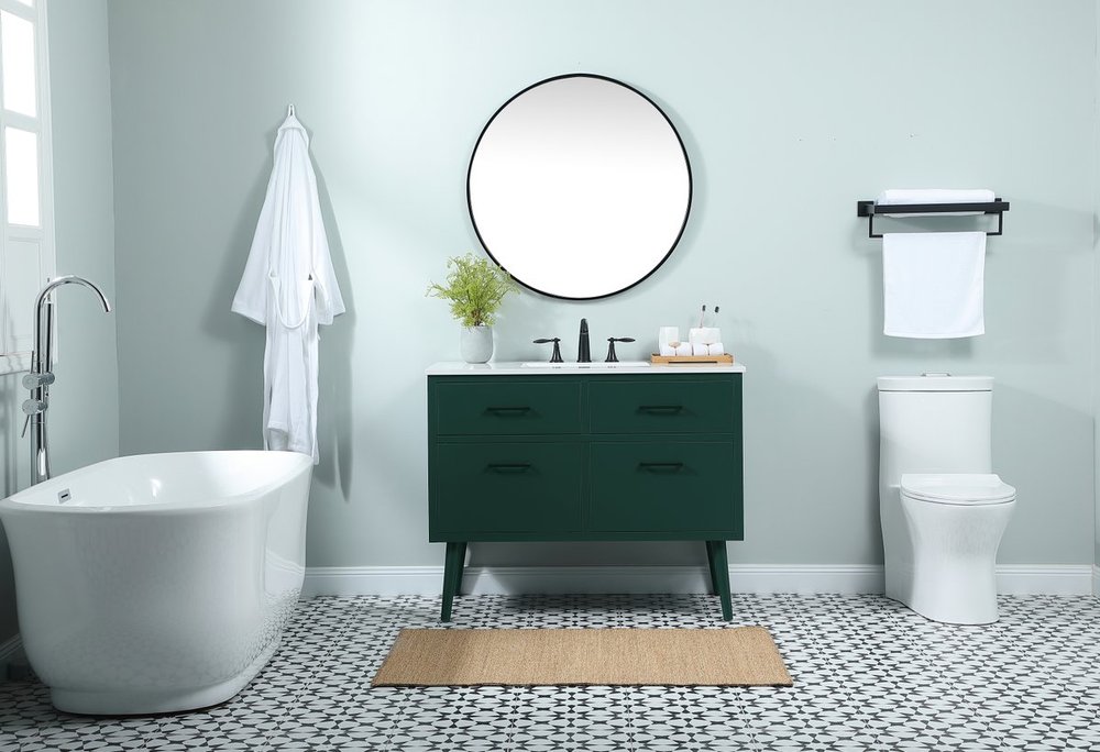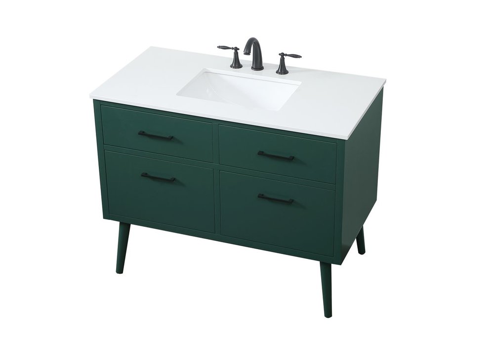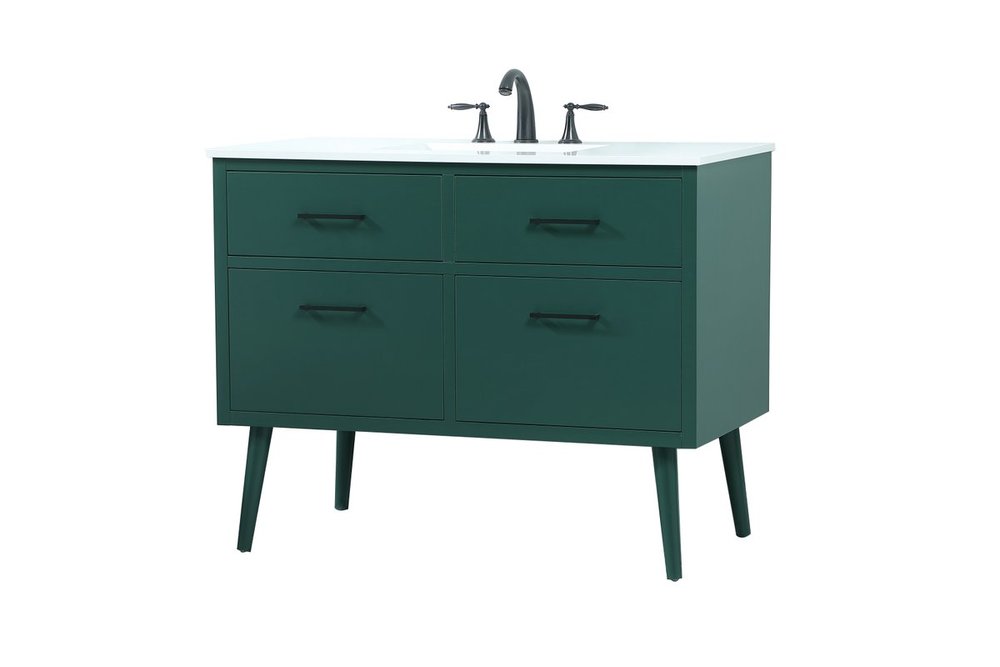 Delve into a world of minimalistic fashion and contemporary styling with this midcentury modern 42" vanity. The clean lines anchors the design, while the oblique tapered cylinder legs add subtle interest. However, the artful juxtaposition between the green and white creates a blend of bright modernity and classical traditions. A black handle adorns the top fake drawer hiding the base of the integrated porcelain sink while another one allows you to pull the bottom drawer out, letting you store your bathroom necessities and toiletries. The compact size makes it the perfect vanity for any bathroom or powder room, regardless of size.