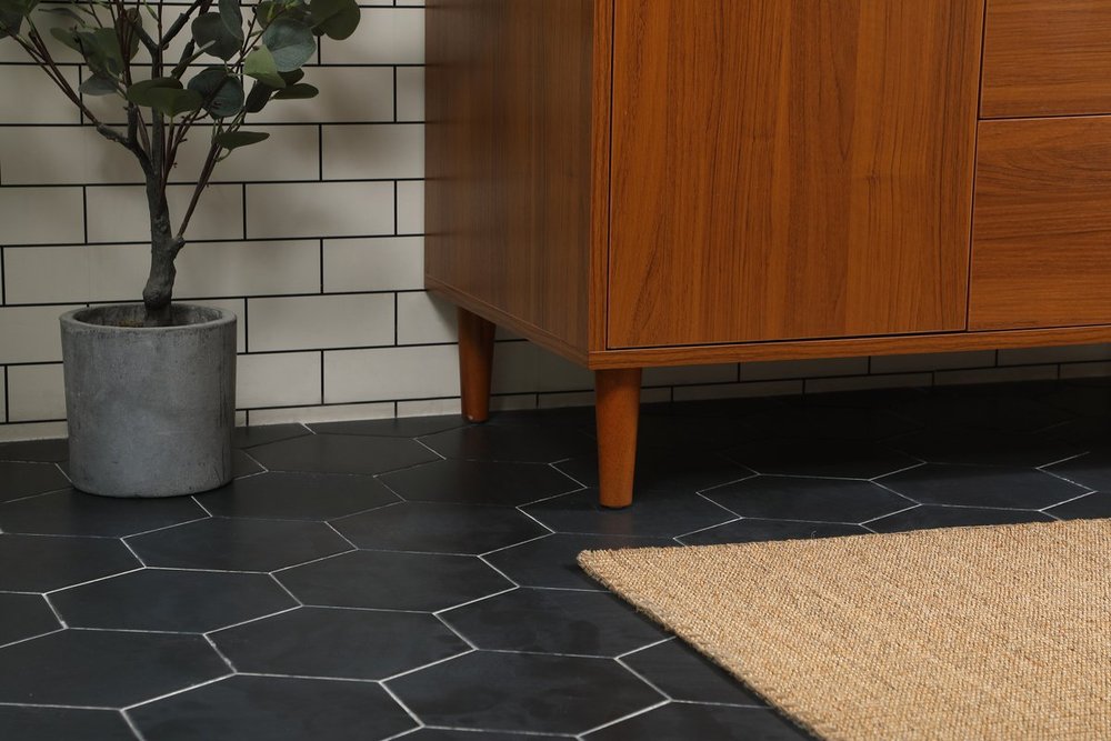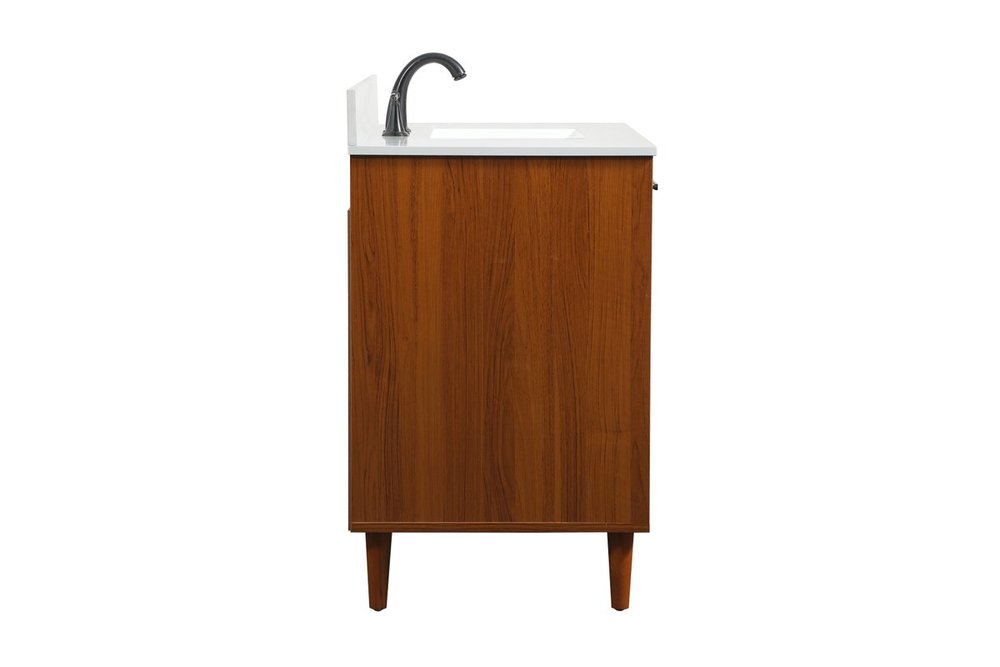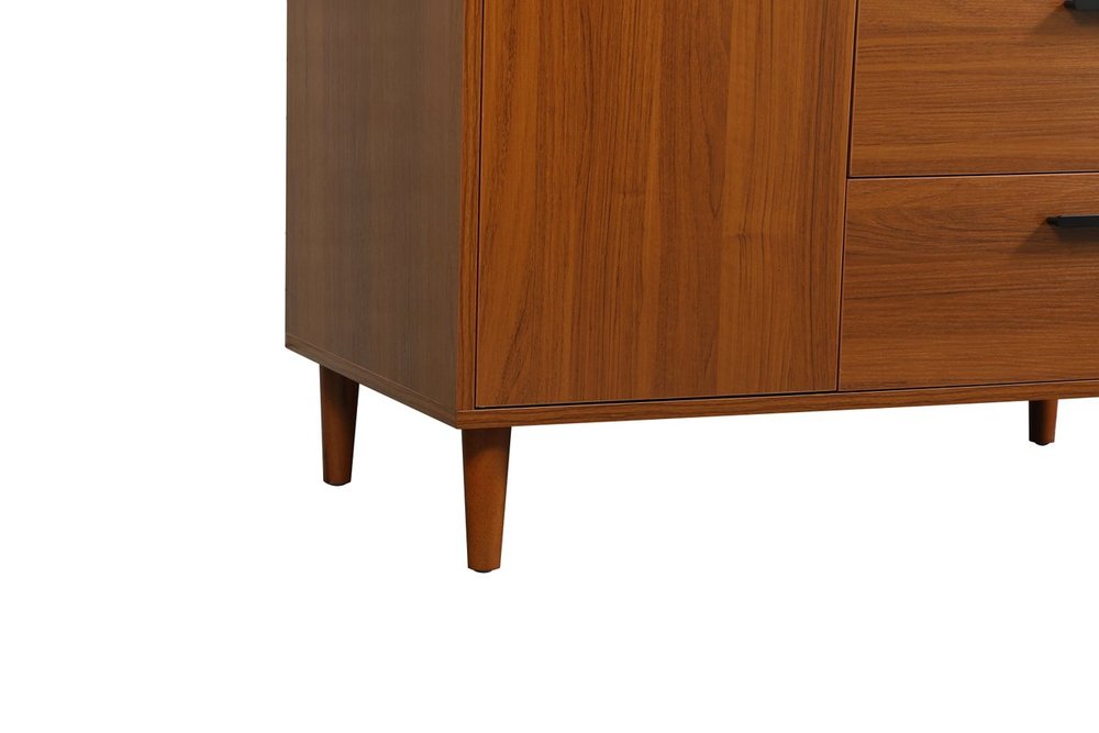 Modern sophistication is defined with the teak finish and black barpulls of this vanity and slender tapered legs. Its length makes it the perfect addition to any sized home, and saves space with its storage area hidden behind the Single cabinet door and two bottom drawers. Topped with a highly durable engineered stone countertop and a porcelain undermount sink, this modern design will become your focal point of your bathroom. Comes with a matching backsplash to complete the look and protects your wall. Equipped with soft-closing drawer and doors adds a quiet functional touch.