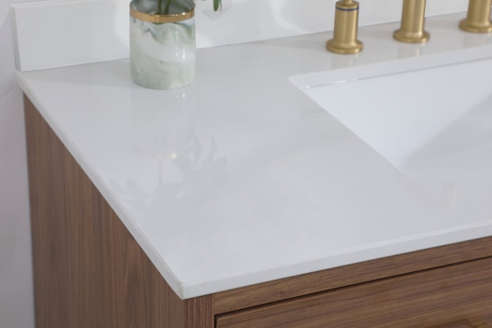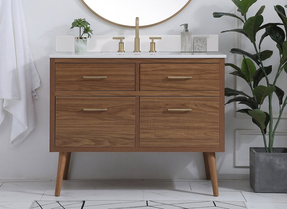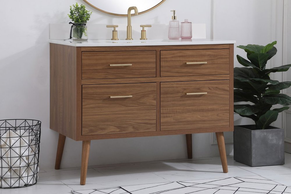 Delve into a world of minimalistic fashion and contemporary styling with this midcentury modern 42" vanity. The clean lines anchors the design, while the oblique tapered cylinder legs add subtle interest. However, the artful juxtaposition creates a blend of bright modernity and classical traditions. A gold handle adorns the top fake drawer hiding the base of the undermount porcelain sink while another one allows you to pull the bottom drawer out, letting you store your bathroom necessities and toiletries. The compact size makes it the perfect vanity for any bathroom or powder room, regardless of size. Comes with a matching backsplash to complete the look and protects your wall.