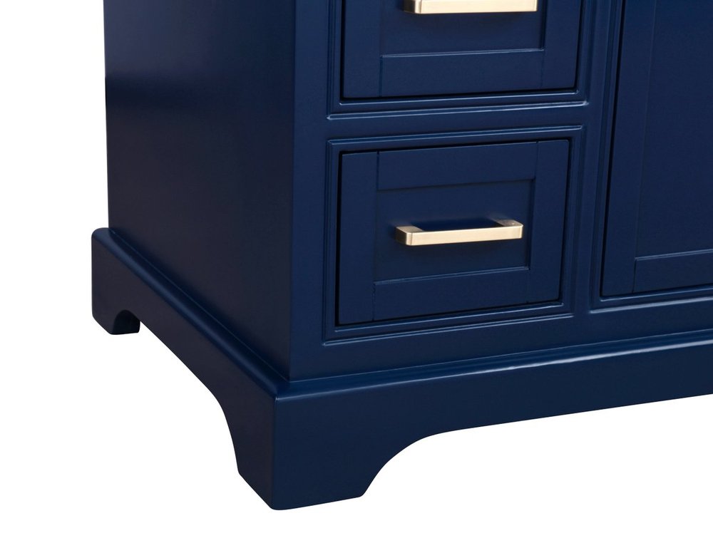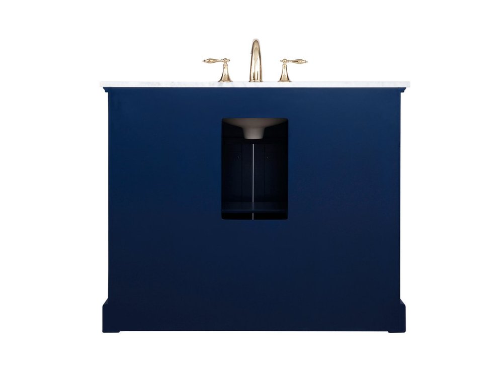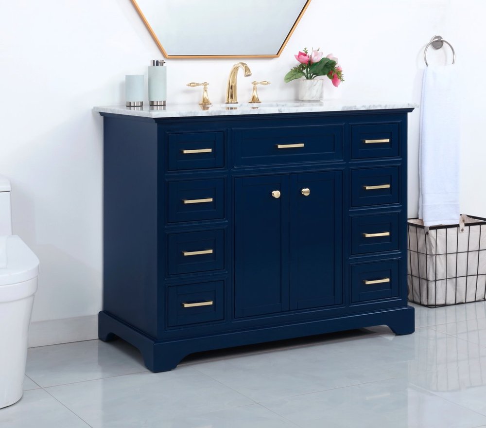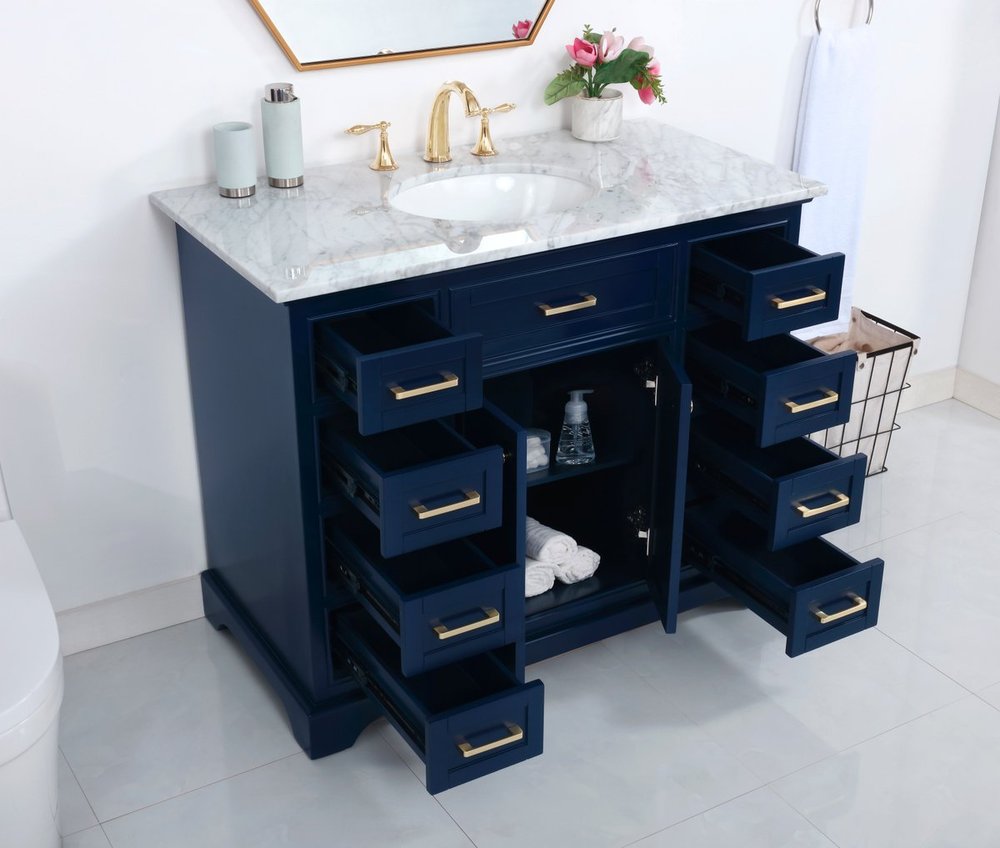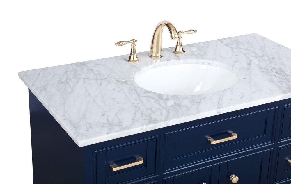 From its Italian Carrara white marble top to its contemporary-styled hand painted blue cabinet, it is sure to enhance either your home or office bathroom. Beneath its lustrous, natural marble top and an oval, white porcelain under mount sink, is a cabinet with 3 handsome drawers on each side and 2 center doors with a Single shelf for all your bathroom essentials, highlighted with recessed panel doors, brushed gold bar handle and knobs, stands on strong solid pedestal feet. A wonderful balance of simplicity and practical function! Measurements: W42”xD21.5”xH35”