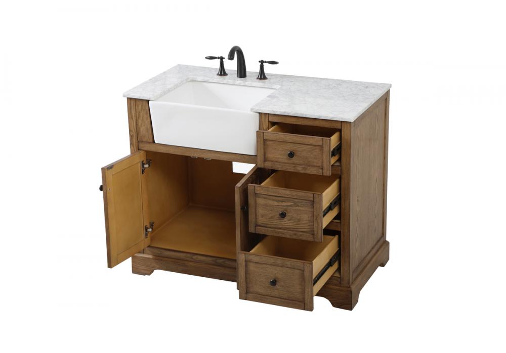 Make the most of your space with this farmhouse style bathroom vanity. Complements well with its beautiful finish, carrara white marble countertop, and the contemporary slender handle bar that sits on the functional drawers with soft closing mechanism, allowing you to store an assortment of bathroom essentials. The lower shelf makes it the perfect space to hold new towels for your guests. This stylish vanity ensures both form and function in your bathroom for you and your guests.