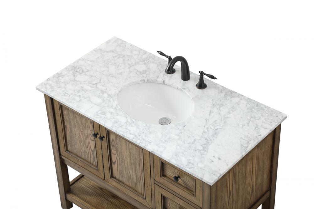 Comes with an undermount porcelain sink and a carrara white marble countertop