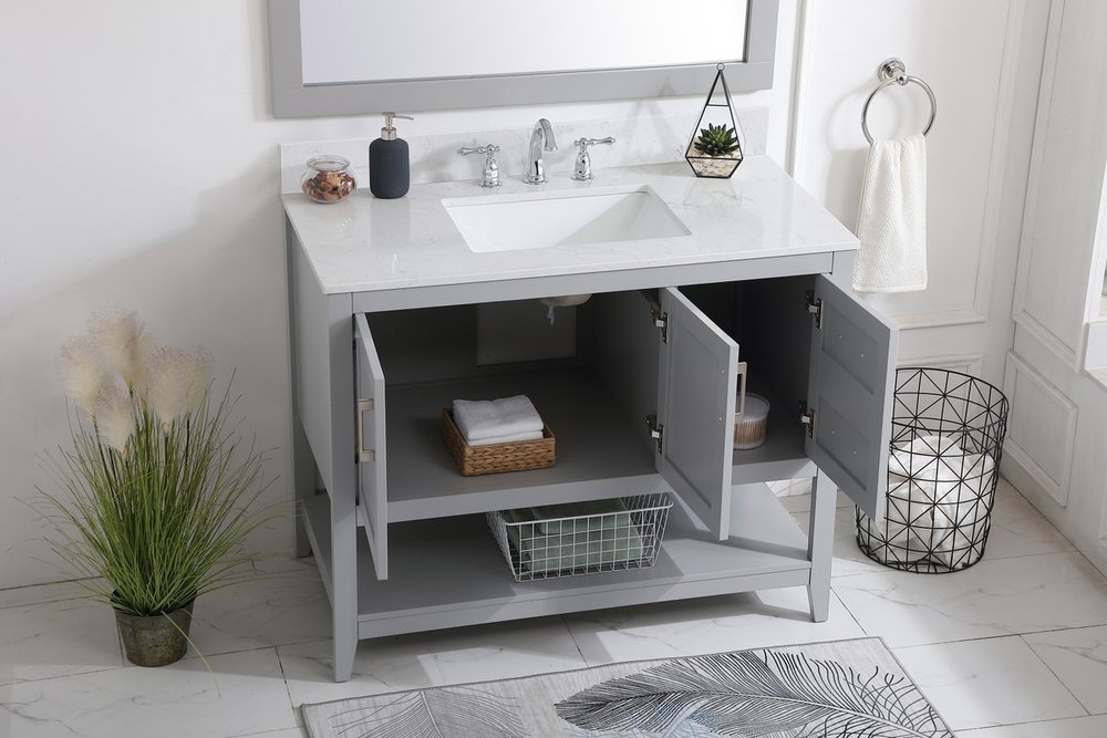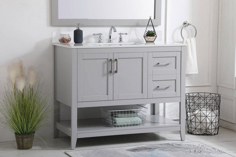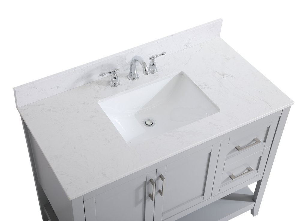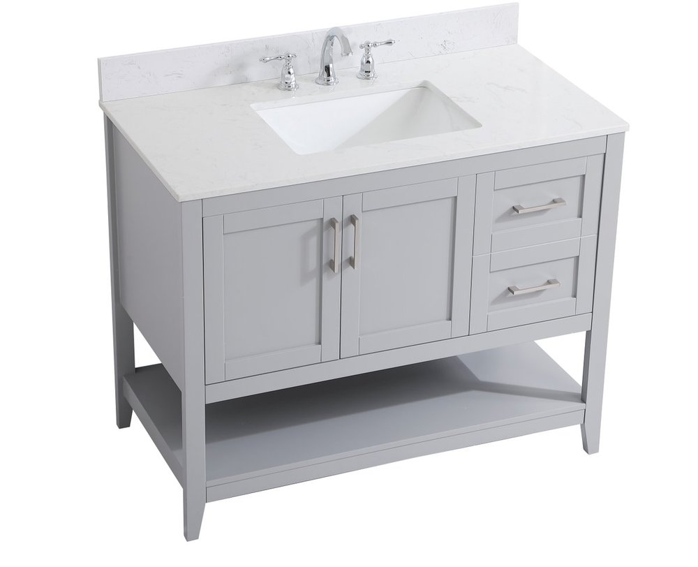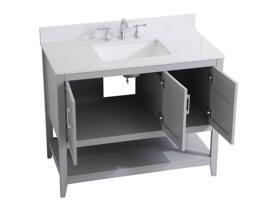 The nonchalant attitude of this 42" traditional grey finish vanity will have you wanting more. The slender brushed nickel handle bars open the 3 cabinet doors to reveal ample storage space to put away and store bathroom essentials, and the open space below allows for you to place clean towels on the rack. Topped with a Calacatta engineered marble countertop, you and your guests will enjoy this easy going vanity. Comes with a matching backsplash to complete the look and protects your wall.