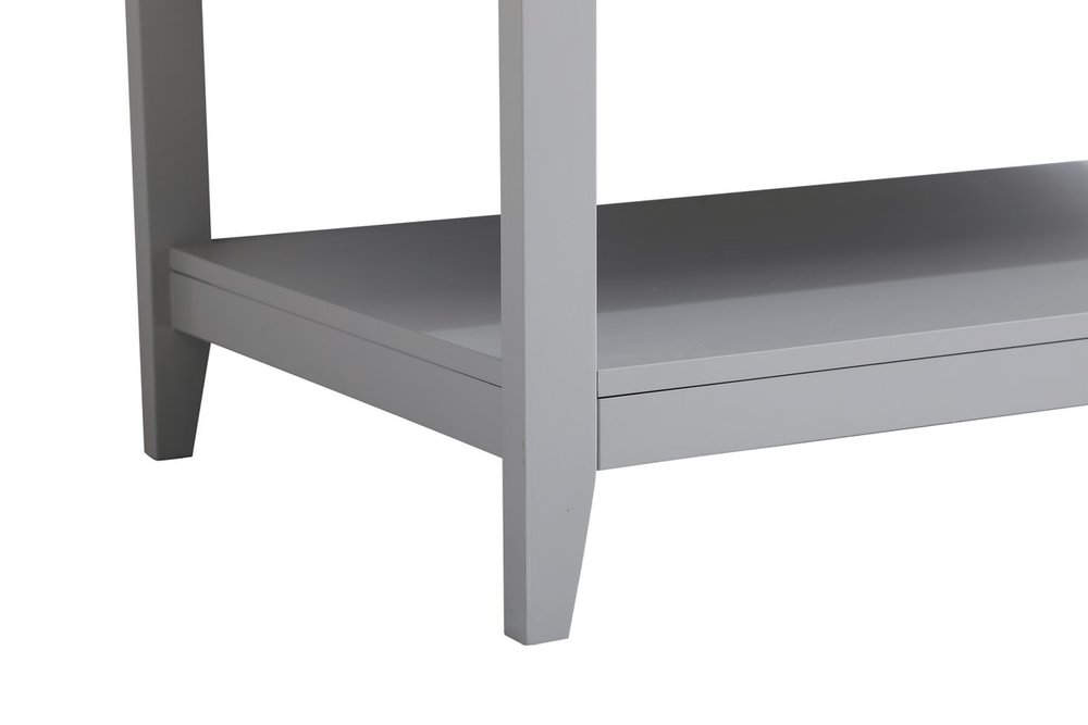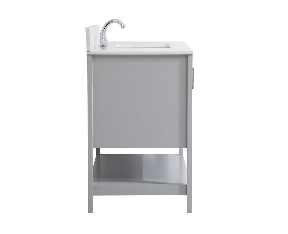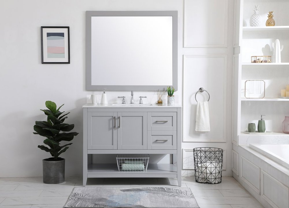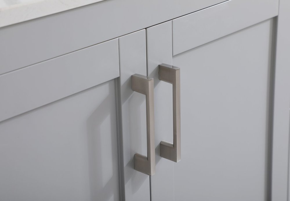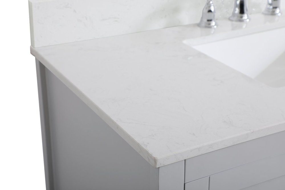 The nonchalant attitude of this 42" traditional grey finish vanity will have you wanting more. The slender brushed nickel handle bars open the 3 cabinet doors to reveal ample storage space to put away and store bathroom essentials, and the open space below allows for you to place clean towels on the rack. Topped with a Calacatta engineered marble countertop, you and your guests will enjoy this easy going vanity. Comes with a matching backsplash to complete the look and protects your wall.