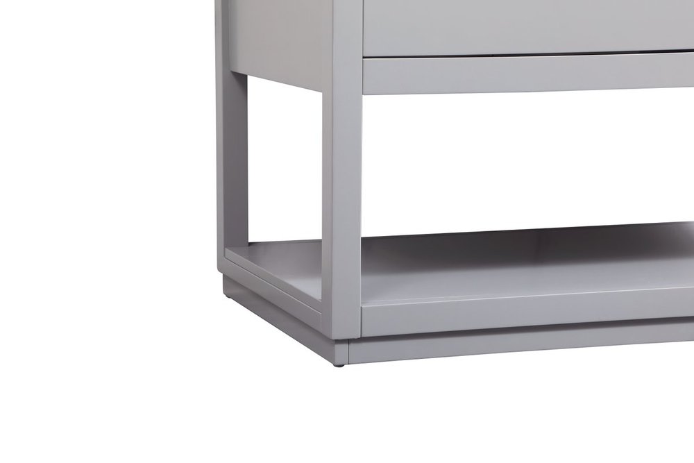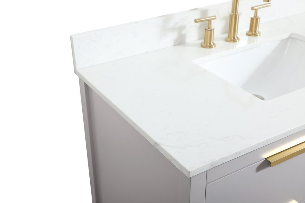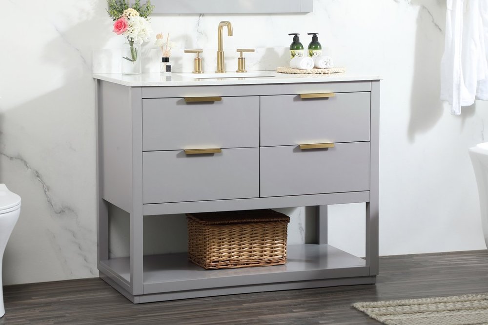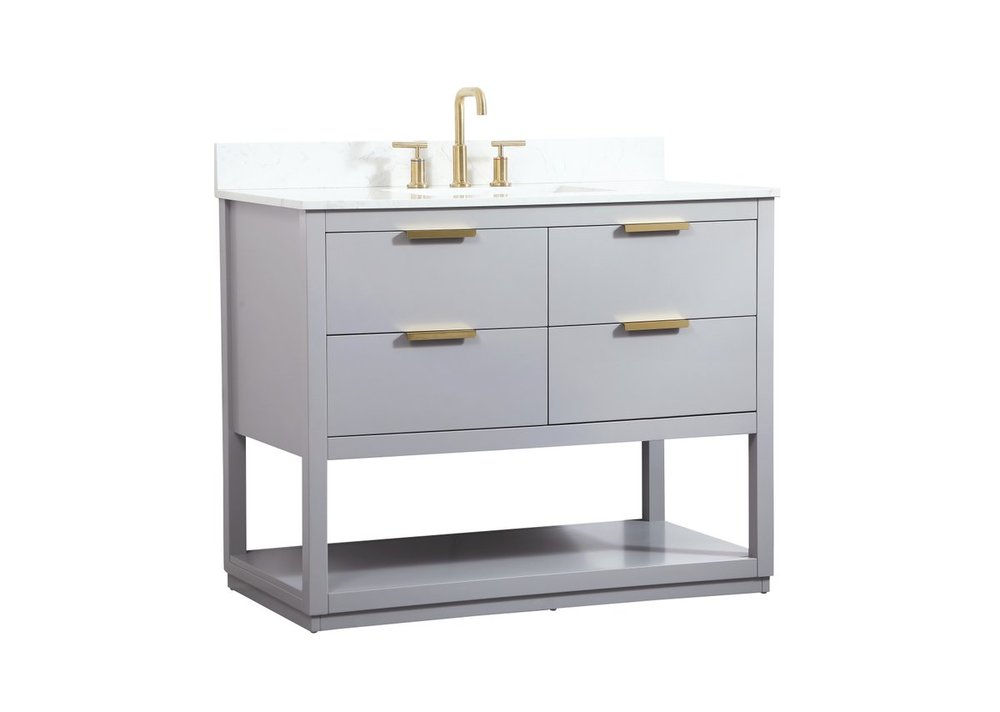 Live in modern comfort with this 42" gray finish vanity. Dressed in a gray and sleek gold metal hardware, its contemporary style will have your bathroom or powder room elevated in modern sophistication. The open shelf at the base and four drawers reveal ample storage space for your bathroom essentials and miscellany. Clean lines create its own visual interest, adding trendy looks to your already chic room. Comes with a matching backsplash to protect your walls.