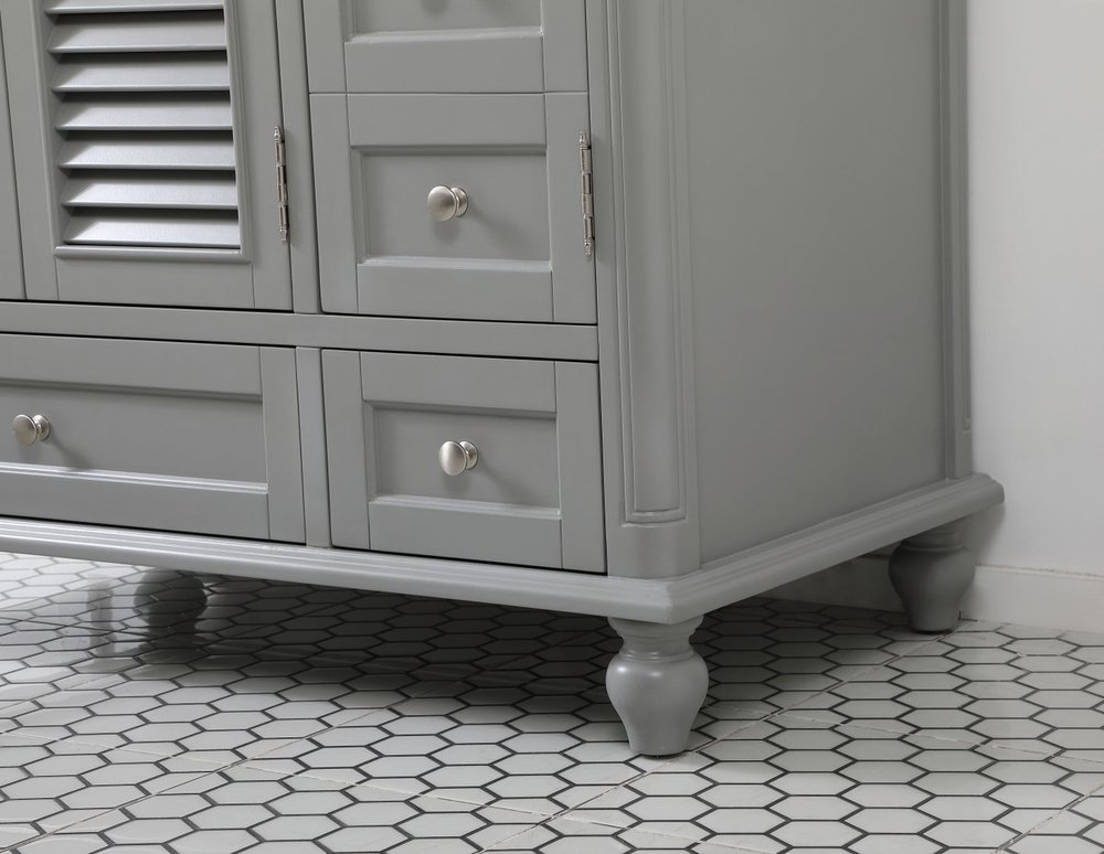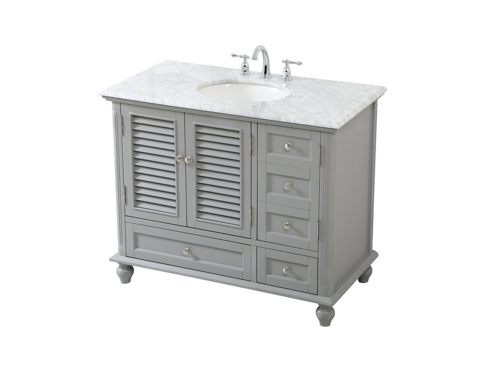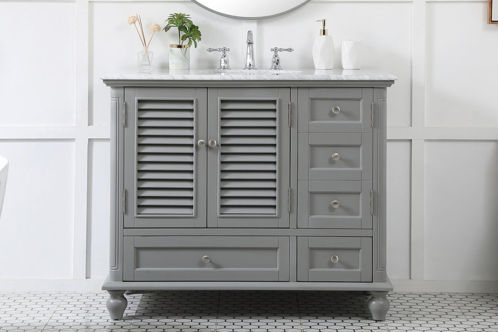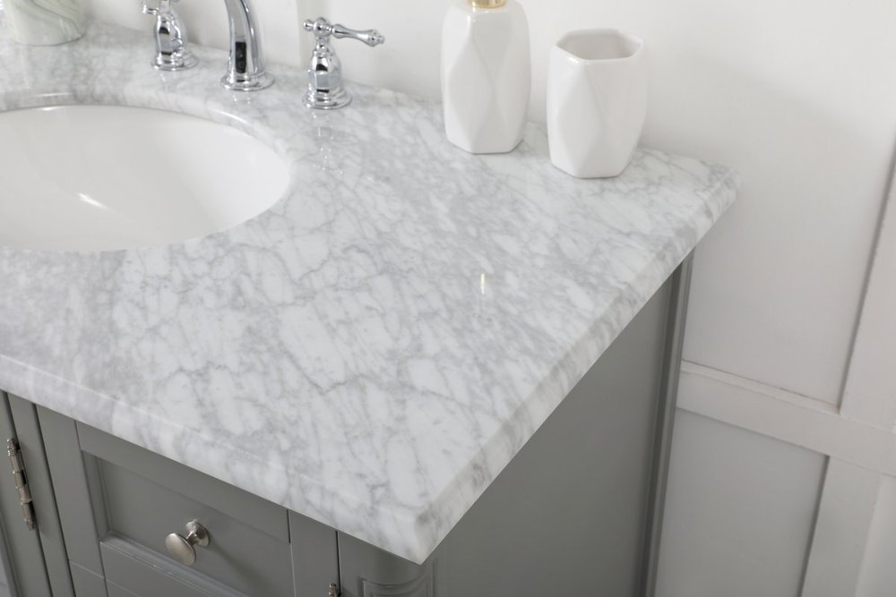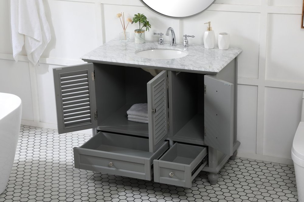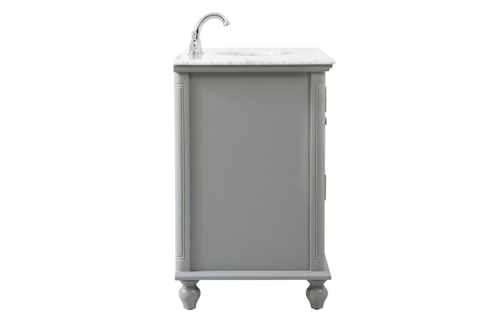 The Rhodes collection compact vanity will add lovely sophistication and complement any small bathroom or powder room, while utilizing its charm and function to provide you with ample storage spaces. Metal round knobs gently adorn the shuttered cabinet door and drawer at the base, allowing for you to store away your bathroom essentials. The Carrara white marble countertop, porcelain undermount sink, dignified subtle engravings on the side edges, and rounded legs all come together to create contemporary beauty. Work with your space, and design a beautiful room, no matter the size.