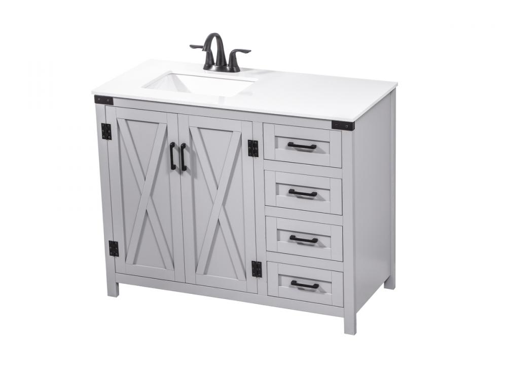 Reminiscent of barn doors, the two door cabinet and four drawers adds both stylistic charm and function with its plethora of storage options for all your bathroom essentials. Whether for your bathroom or the guests', everyone will marvel at its classic look for traditional and farmhouse aesthetics. A slab of engineered marble rounds out the piece up top, as well as the porcelain under mount sink and predrilled faucet holes. This vanity arrives fully assembled.