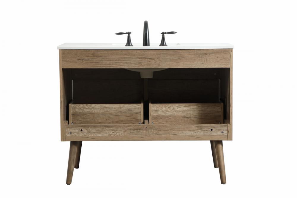 This bathroom vanity is a perfect way to outfit your home in authetic midcentury modern style. The clean lines anchors the design, while the oblique tapered cylinder legs add subtle interest. A black handle adorns the top drawer hiding the base of the undermount porcelain sink while another one allows you to pull the bottom drawer out, letting you store your bathroom necessities and toiletries. The storage drawers provide much needed function and can be used for stowing items like extra toothbrushes, hairbrushes, and other bathroom essentials to help you get ready to face the day. This vanity is a quick update for your bathroom with trendy style.