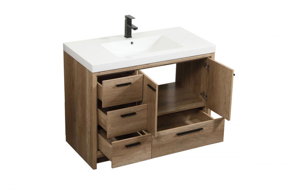 Modern sophistication is defined within the wood finish look and black barpulls of this vanity. Its length makes it the perfect addition to any sized home, and saves space with its storage area hidden behind the double cabinet doors and one bottom drawers. Topped with a highly durable thick resin white counter top and an integrated sink, this modern design will add everlasting class to your bathroom and powder room.
