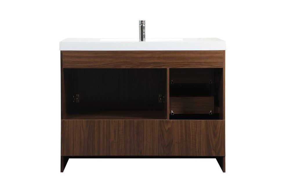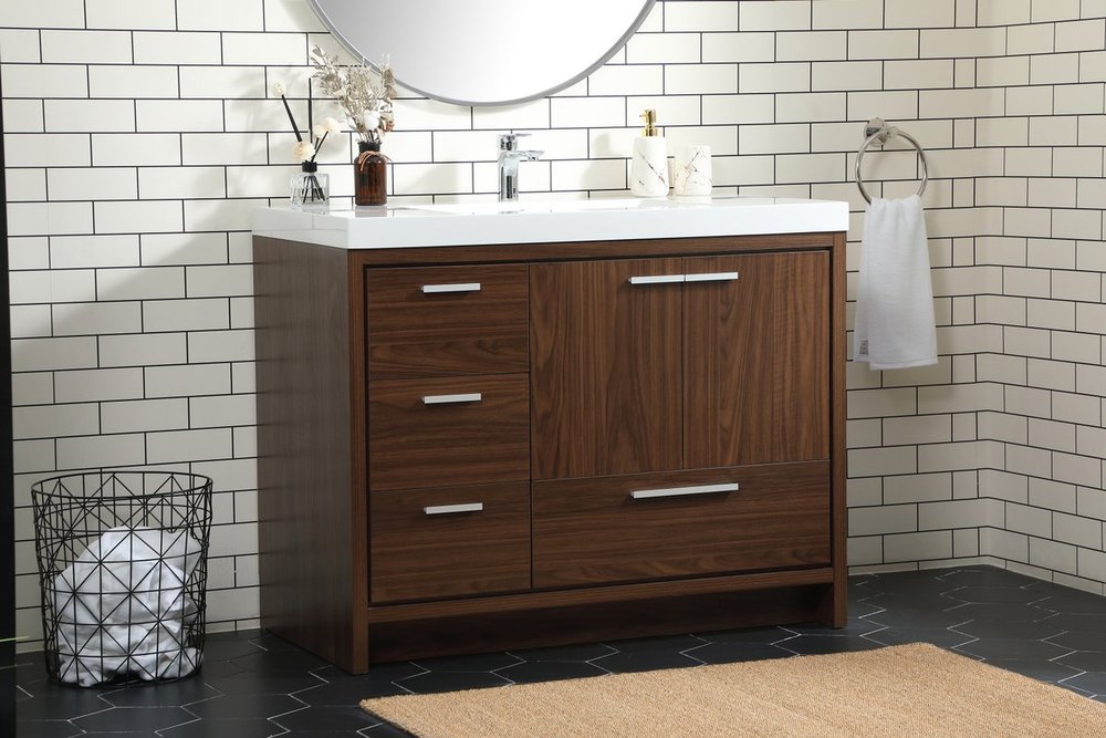 Modern sophistication is defined within the walnut finish and silver barpulls of this vanity. Its length makes it the perfect addition to any sized home, and saves space with its storage area hidden behind the double cabinet doors and one bottom drawers. Topped with a highly durable resin white counter top and an integrated sink, this modern design will add everlasting class to your bathroom and powder room.