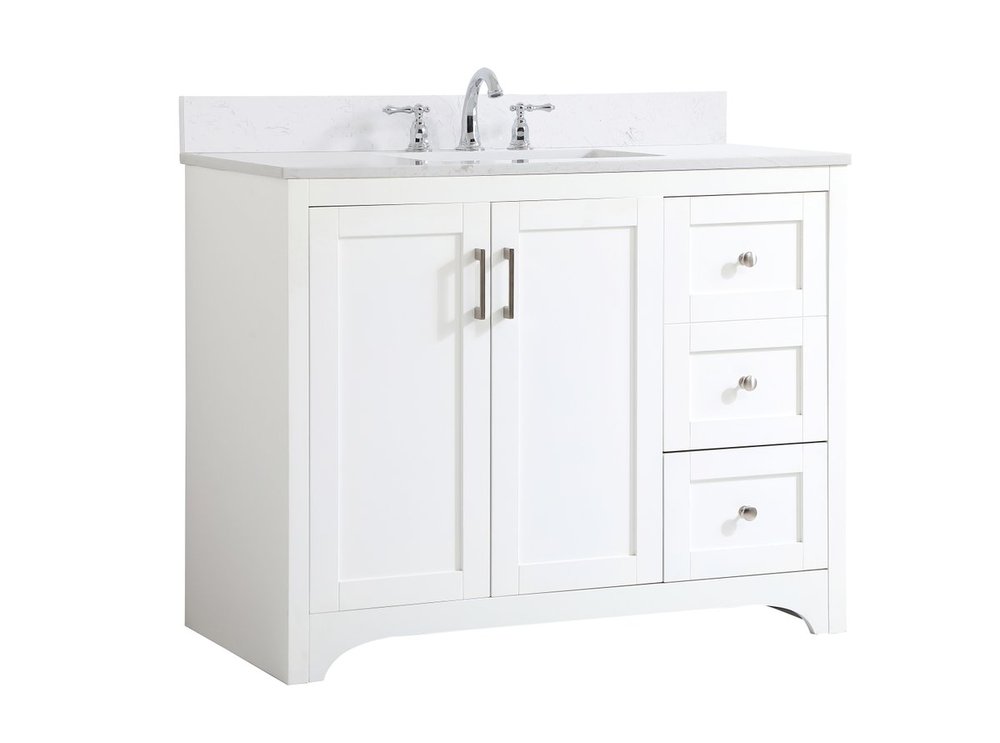 The refined simplicity of this 42" white finish vanity creates a peaceful, yet stylish, atmosphere. Its traditional modernity adds a mature beauty that will elevate any bathroom or powder room--the Calacatta engineered marble counter top adds refined luxe while the brushed nickel handle bars open the double cabinet doors and 2 side drawers, revealing ample storage space to store and hide away an assortment of bathroom essentials. Whether your home is large or small, this vanity will surely fit in well. Comes with a matching backsplash to complete the look and protects your wall.