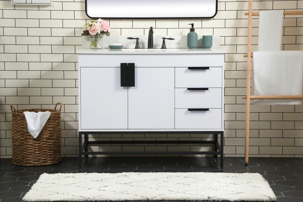 This vanity is a sleek-looking piece of bathroom furniture that is easy to incorporate into your design scheme. The cabinet features a smooth door panel with an oversized steel handle and soft close hinges provide ample room for accessories. Constructed of engineered wood, the powder-coated metal rod legs are an urban industrial look that we love. Minor assembly of the metal legs needed to get this vanity up and running. Comes with a matching backsplash to complete the look and protects your wall.