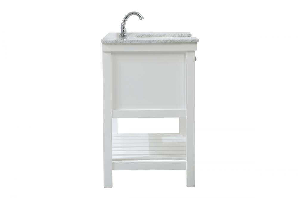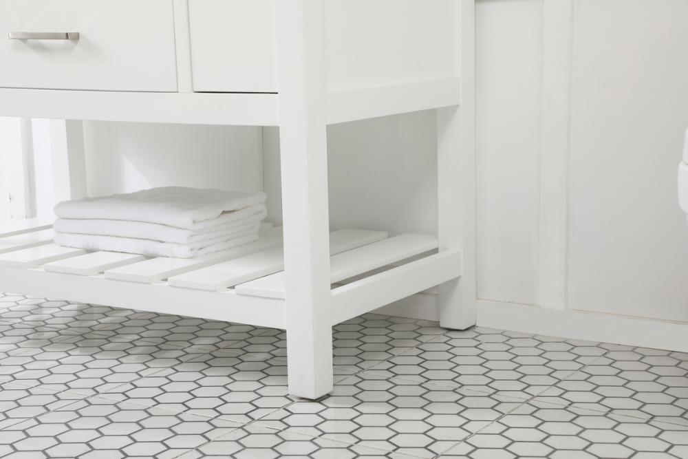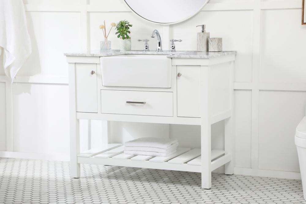 Make the most of your space with this farmhouse style bathroom vanity. Complements well with its beautiful finish, carrara white marble countertop, and the contemporary slender handle bar that sits on the functional drawers with soft closing mechanism, allowing you to store an assortment of bathroom essentials. The lower shelf makes it the perfect space to hold new towels for your guests. This stylish vanity ensures both form and function in your bathroom for you and your guests.
