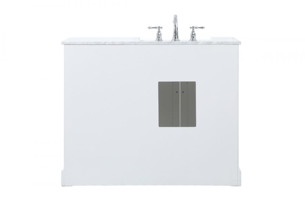 Make the most of your space with this farmhouse style bathroom vanity. Complements well with its beautiful finish, carrara white marble countertop, and the contemporary slender handle bar that sits on the functional drawers with soft closing mechanism, allowing you to store an assortment of bathroom essentials. The lower shelf makes it the perfect space to hold new towels for your guests. This stylish vanity ensures both form and function in your bathroom for you and your guests.