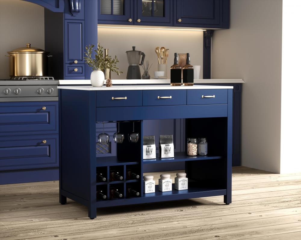 Transform your kitchen into a functional and stylish space with this versatile kitchen island. Measuring 48" L x 26" W x 36" H, it combines a stunning engineered marble countertop with a durable solid wood and MDF frame to bring both beauty and practicality to your home. The island features three spacious drawers with soft-closing glides and French dovetail construction, perfect for keeping utensils and essentials organized. Open shelves and built-in wine storage—including six bottle holders and three rows of hanging glass racks—add functionality with a touch of sophistication.