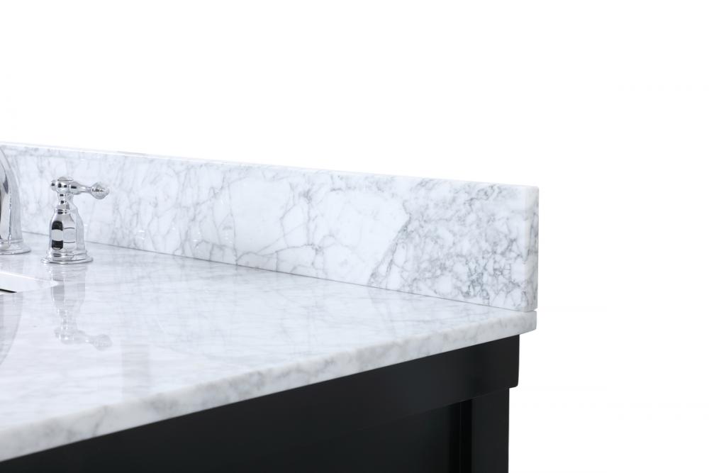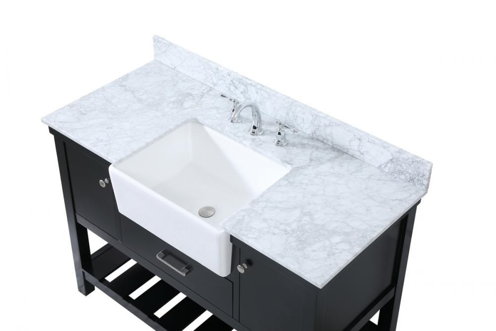 Make the most of your space with this farmhouse style bathroom vanity. Complements well with its beautiful finish, carrara white marble countertop, and the contemporary slender handle bar that sits on the functional drawers with soft closing mechanism, allowing you to store an assortment of bathroom essentials. The lower shelf makes it the perfect space to hold new towels for your guests. This stylish vanity ensures both form and function in your bathroom for you and your guests.