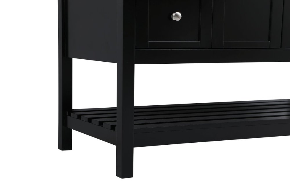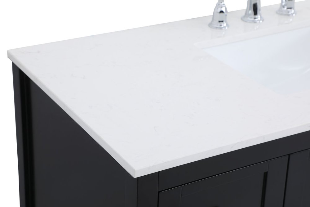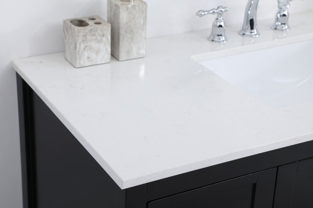 The subtle beauty of the Theo collection 48" vanity in a black finish exudes comfortable luxury. Its modern, yet traditional beauty will surely dress up your bathroom or powder room without any fuss. The white stone countertop and porcelain undermount sink shows quiet opulence, and the legs support upright without fail. Brushed Nickel hardware complements the trendy black finish, with pulls adorning the two cabinet doors and four drawers, showcasing ample storage space within. Slated shelf allows for additional space to organize your towels. Whether this vanity is in your bathroom or for guests, its presence will surely elevate the aesthetics of your room.