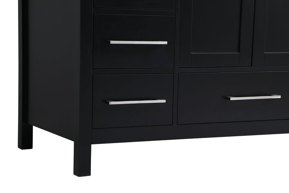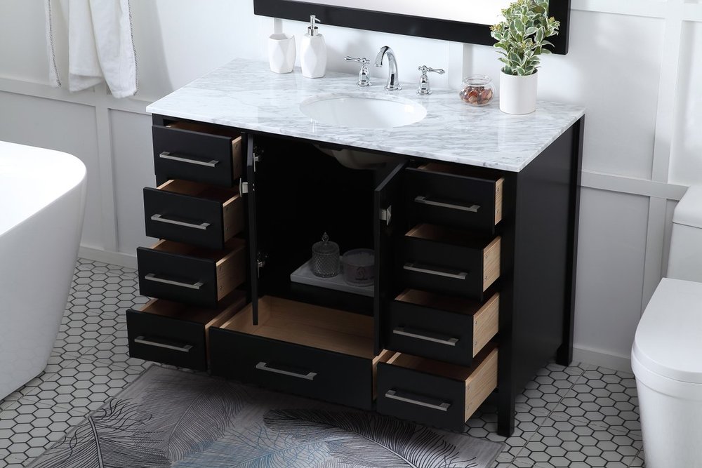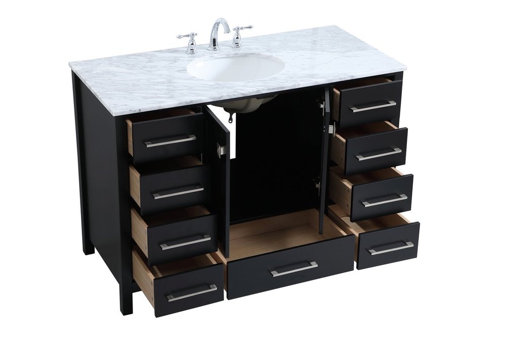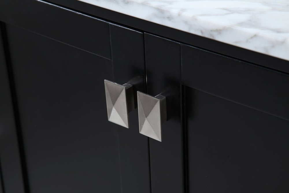 Never compromise beauty--the Erina collection stunning vanity in a black finish will add lovely sophistication and complement any bathroom or powder room, while utilizing its charm and function to provide you with ample storage spaces. Brushed nickel pulls gently adorn the minimalist cabinet doors and drawers at the base, allowing for you to store away your bathroom essentials. The Carrara white marble countertop, porcelain undermount sink, dignified subtle engravings on the side edges, and squared legs all come together to create contemporary beauty. Work with your space, and design a beautiful room, no matter the size.