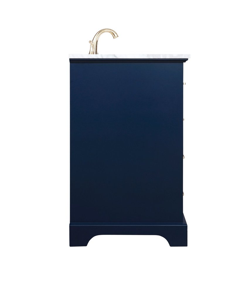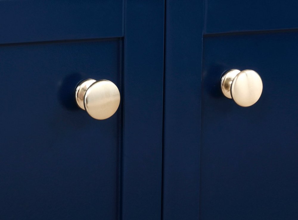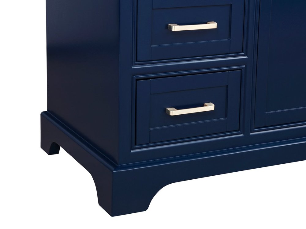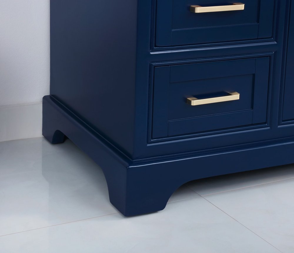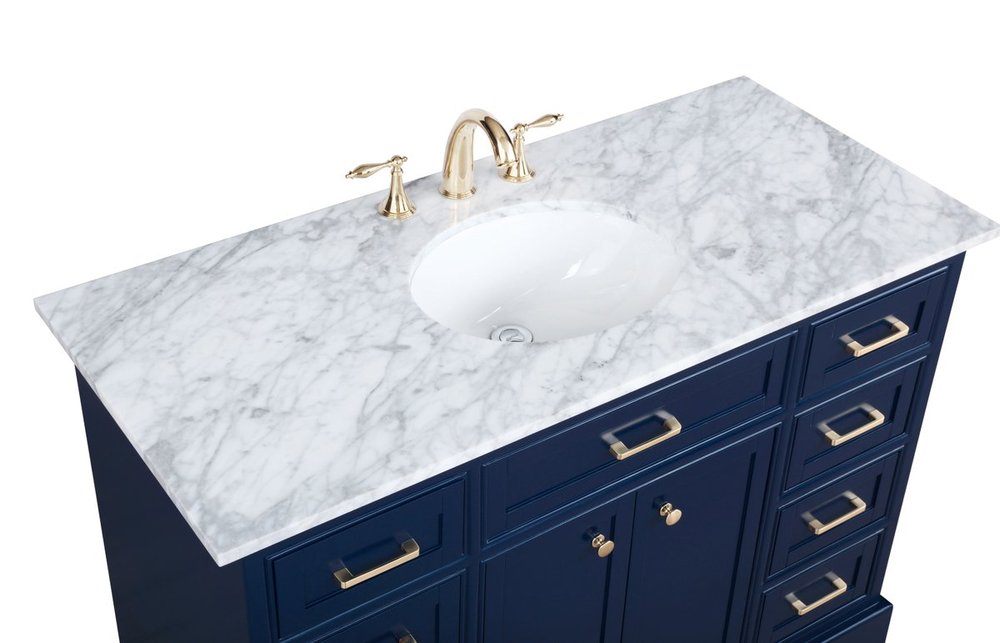 From its Italian Carrara white marble top to its contemporary-styled hand painted blue cabinet, this member of our “Americana” vanity collection is sure to enhance either your home or office bathroom. Beneath its lustrous, natural marble top and an oval, white porcelain under mount sink, is a cabinet with 4 handsome drawers on each side and 2 center doors with a Single shelf for all your bathroom essentials, highlighted with recessed panel doors, brushed gold bar handle and knobs, stands on strong solid pedestal feet. A wonderful balance of simplicity and practical function! Measurements: W48”xD21.5”xH35”