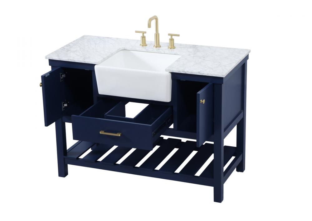 Make the most of your space with this farmhouse style bathroom vanity. Complements well with its beautiful finish, carrara white marble countertop, and the contemporary slender handle bar that sits on the functional drawers with soft closing mechanism, allowing you to store an assortment of bathroom essentials. The lower shelf makes it the perfect space to hold new towels for your guests. This stylish vanity ensures both form and function in your bathroom for you and your guests.