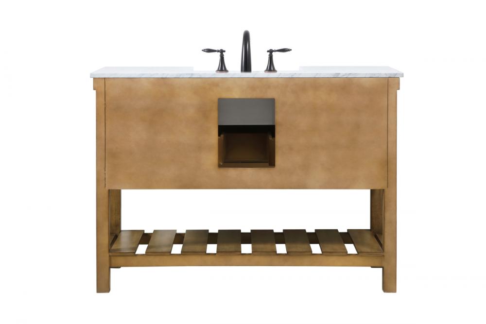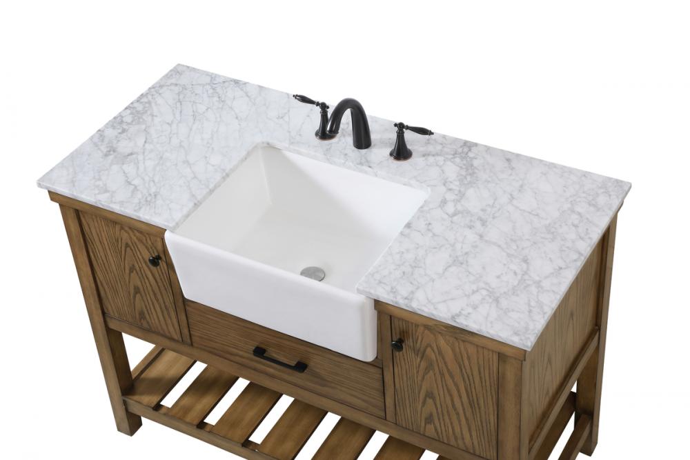 Make the most of your space with this farmhouse style bathroom vanity. Complements well with its beautiful finish, carrara white marble countertop, and the contemporary slender handle bar that sits on the functional drawers with soft closing mechanism, allowing you to store an assortment of bathroom essentials. The lower shelf makes it the perfect space to hold new towels for your guests. This stylish vanity ensures both form and function in your bathroom for you and your guests.