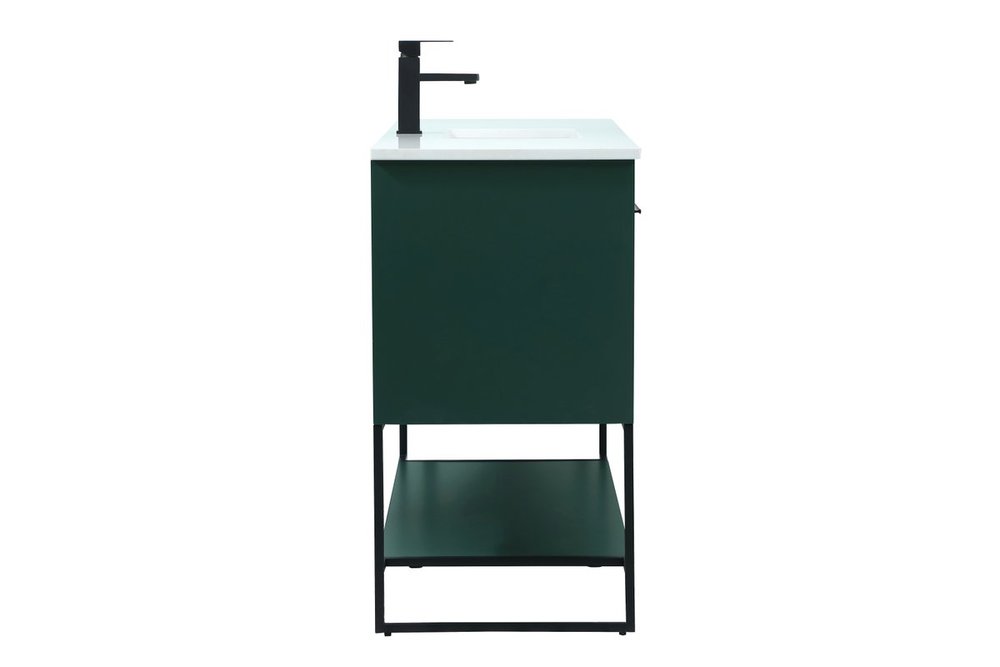 Live in modern comfort with this 48" green finish vanity. Dressed in a green and sleek black metal hardware, its contemporary style will have your bathroom or powder room elevated in industrial sophistication. The open shelf at the base and three doors reveal ample storage space for your bathroom essentials and miscellany. Clean lines create its own visual interest, adding trendy looks to your already chic room.