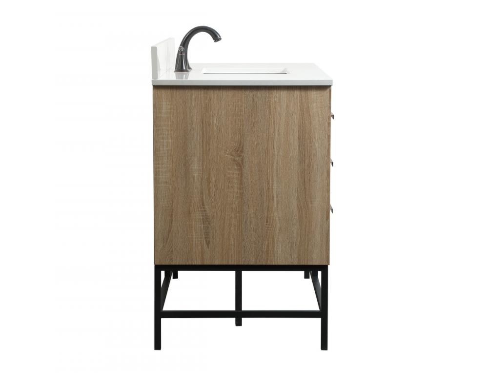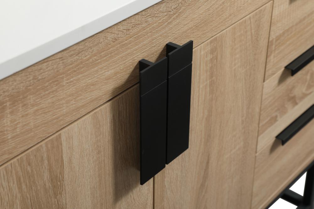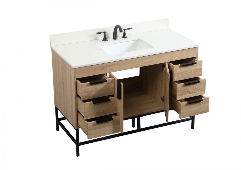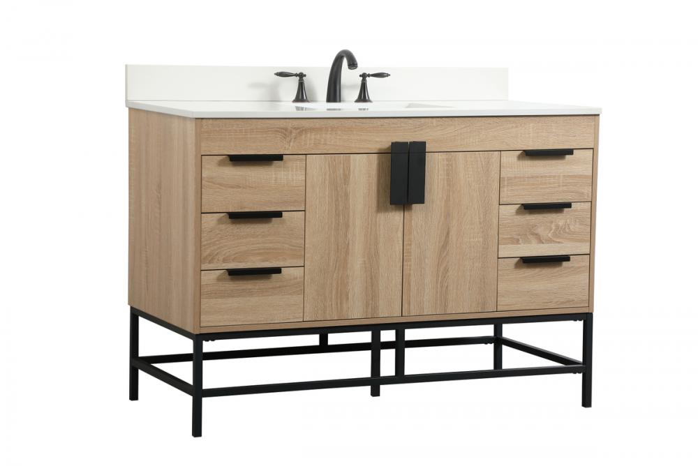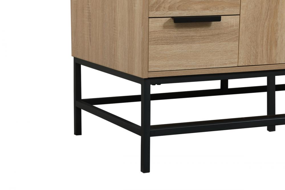This vanity is a sleek-looking piece of bathroom furniture that is easy to incorporate into your design scheme. The cabinet features a smooth door panel with an oversized steel handle and soft close hinges provide ample room for accessories. Packed with multiple side drawers with soft close glides for added comfort and full access to bath supplies. Constructed of engineered wood, the powder-coated metal rod legs are an urban industrial look that we love. Minor assembly of the metal legs needed to get this vanity up and running. Comes with a matching backsplash to complete the look and protects your wall. Comes with a matching backsplash to complete the look and protects your wall.