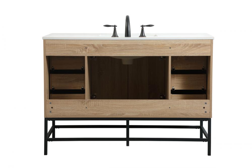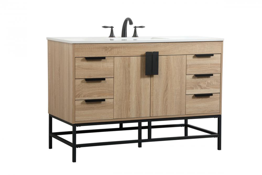 This vanity is a sleek-looking piece of bathroom furniture that is easy to incorporate into your design scheme. The cabinet features a smooth door panel with an oversized steel handle and soft close hinges provide ample room for accessories. Packed with multiple side drawers with soft close glides for added comfort and full access to bath supplies. Constructed of engineered wood, the powder-coated metal rod legs are an urban industrial look that we love. Minor assembly of the metal legs needed to get this vanity up and running. Comes with a matching backsplash to complete the look and protects your wall.