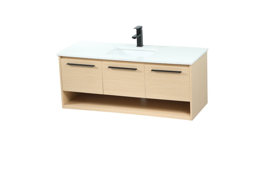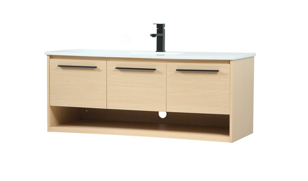Save space and make your bathroom appear bigger with this floating vanity. Its minimal design will have you in awe, while its clean lines will leave your room feeling fresh and uncluttered. The Single u-drawer pulls out for storage while the open space below allows you to place extra towels or various other essentials. The ivory white engineered marble counter top with porcelain sink adds refined luxe while the aluminum barpull style handle adorn the vanity face.