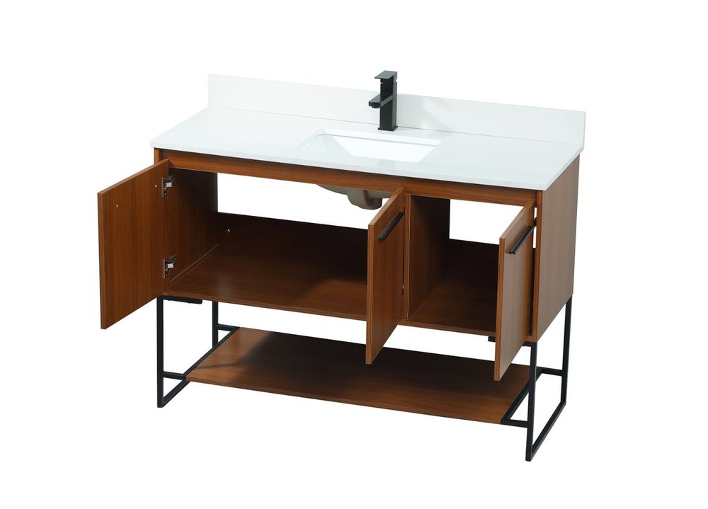 Live in modern comfort with this 48" teak finish vanity. Dressed in a teak and sleek black metal hardware, its contemporary style will have your bathroom or powder room elevated in industrial sophistication. The open shelf at the base and three doors reveal ample storage space for your bathroom essentials and miscellany. Clean lines create its own visual interest, adding trendy looks to your already chic room. Comes with a matching backsplash to complete the look and protects your wall.