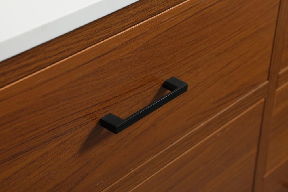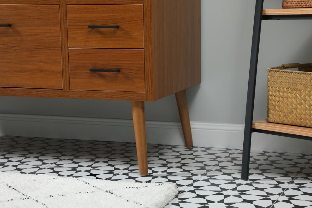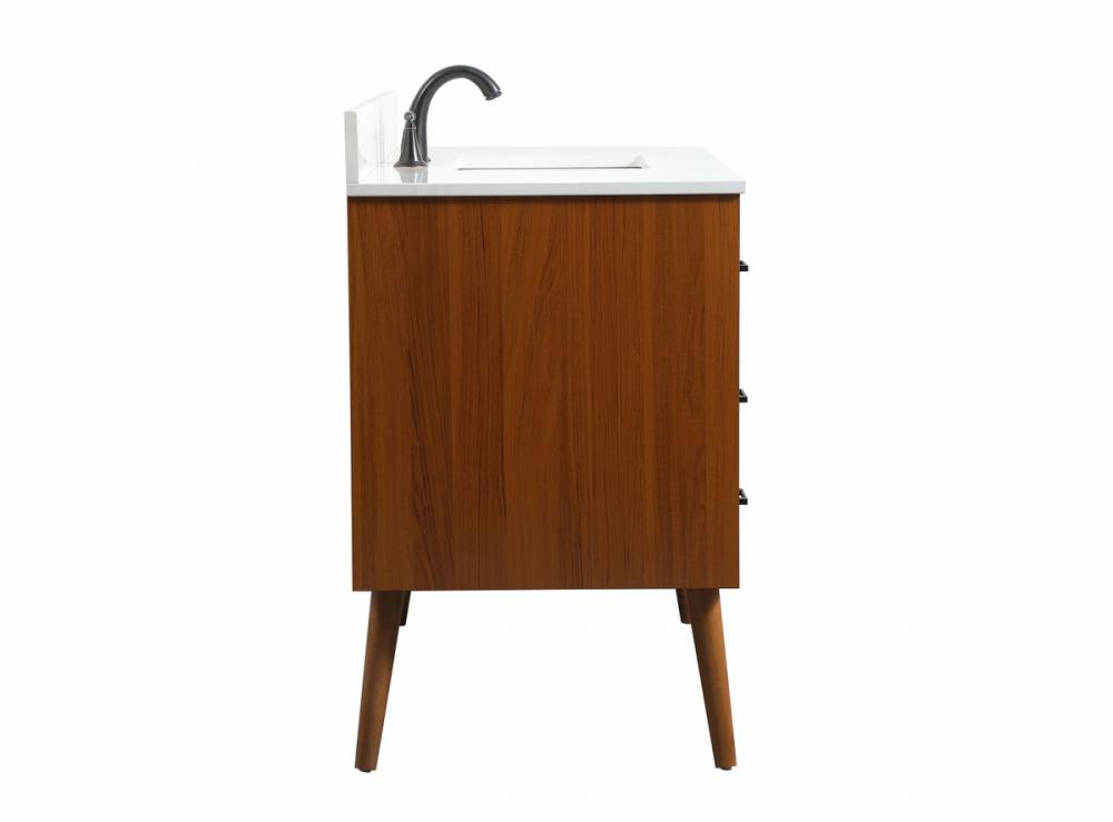 This bathroom vanity is a perfect way to outfit your home in authetic midcentury modern style. The clean lines anchors the design, while the oblique tapered cylinder legs add subtle interest. A black handle adorns the top drawer hiding the base of the undermount porcelain sink while another one allows you to pull the bottom drawer out, letting you store your bathroom necessities and toiletries. The storage drawers provide much needed function and can be used for stowing items like extra toothbrushes, hairbrushes, and other bathroom essentials to help you get ready to face the day. This vanity is a quick update for your bathroom with trendy style. Comes with a matching backsplash to complete the look and protects your wall.