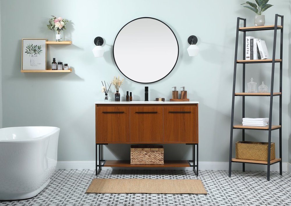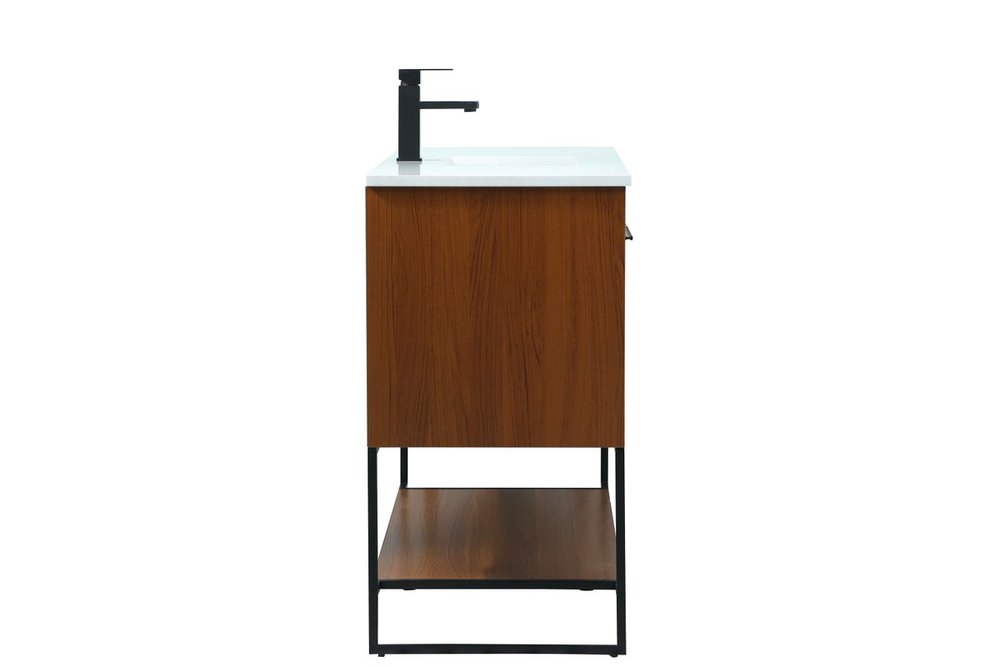 Live in modern comfort with this 48" teak finish vanity. Dressed in a teak and sleek black metal hardware, its contemporary style will have your bathroom or powder room elevated in industrial sophistication. The open shelf at the base and three doors reveal ample storage space for your bathroom essentials and miscellany. Clean lines create its own visual interest, adding trendy looks to your already chic room.