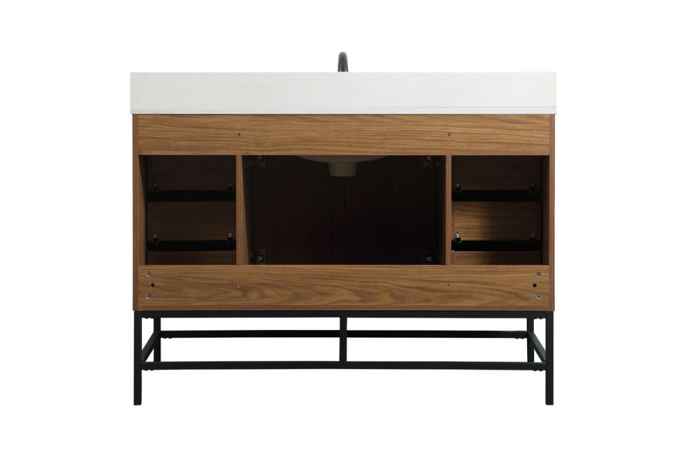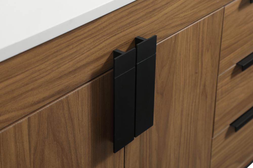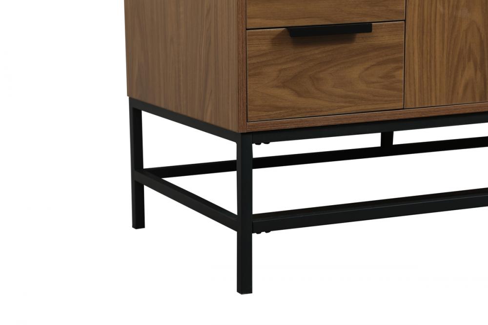 This vanity is a sleek-looking piece of bathroom furniture that is easy to incorporate into your design scheme. The cabinet features a smooth door panel with an oversized steel handle and soft close hinges provide ample room for accessories. Packed with multiple side drawers with soft close glides for added comfort and full access to bath supplies. Constructed of engineered wood, the powder-coated metal rod legs are an urban industrial look that we love. Minor assembly of the metal legs needed to get this vanity up and running. Comes with a matching backsplash to complete the look and protects your wall. Comes with a matching backsplash to complete the look and protects your wall.