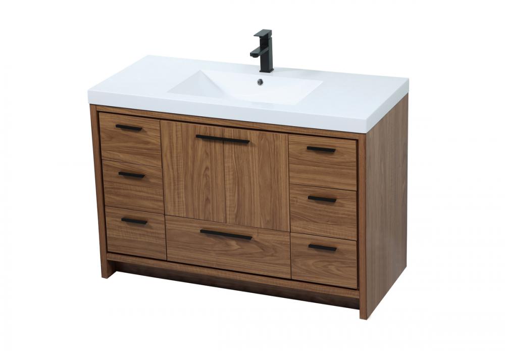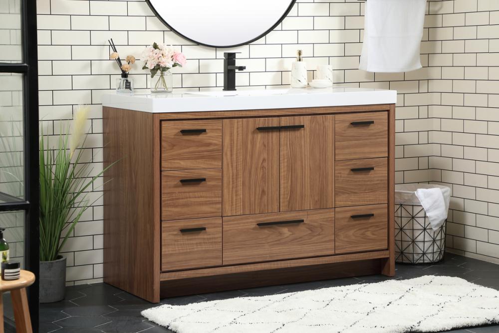 Modern sophistication is defined within the wood finish look and black barpulls of this vanity. Its length makes it the perfect addition to any sized home, and saves space with its storage area hidden behind the double cabinet doors and one bottom drawers. Topped with a highly durable thick resin white counter top and an integrated sink, this modern design will add everlasting class to your bathroom and powder room.