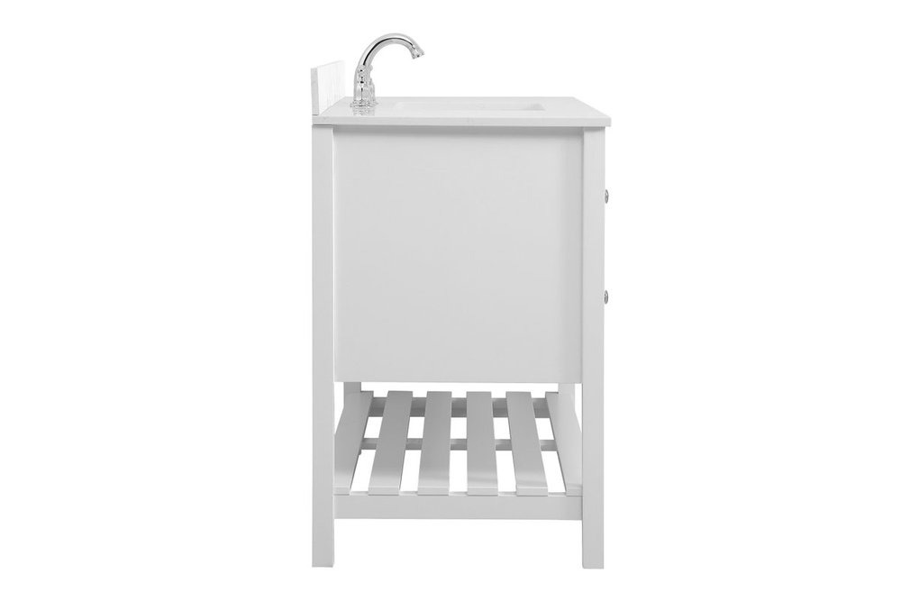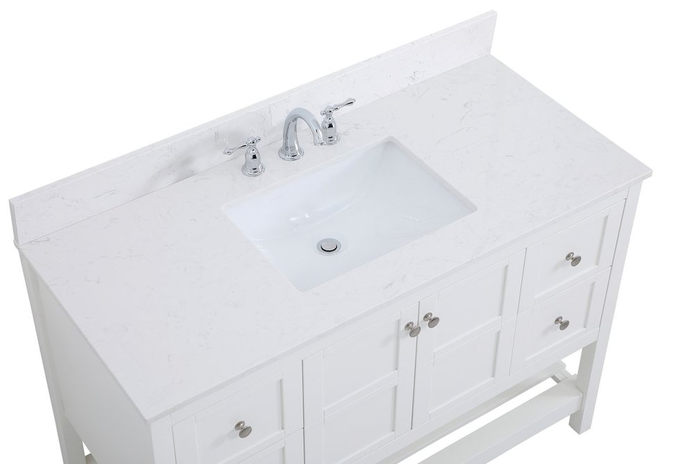 The subtle beauty of the Theo collection 48" vanity in a white finish exudes comfortable luxury. Its modern, yet traditional beauty will surely dress up your bathroom or powder room without any fuss. The white stone countertop and porcelain undermount sink shows quiet opulence, and the legs support upright without fail. Brushed Nickel hardware complements the trendy white finish, with pulls adorning the two cabinet doors and four drawers, showcasing ample storage space within. Slated shelf allows for additional space to organize your towels. Whether this vanity is in your bathroom or for guests, its presence will surely elevate the aesthetics of your room. Comes with a matching backsplash to complete the look and protects your wall.
