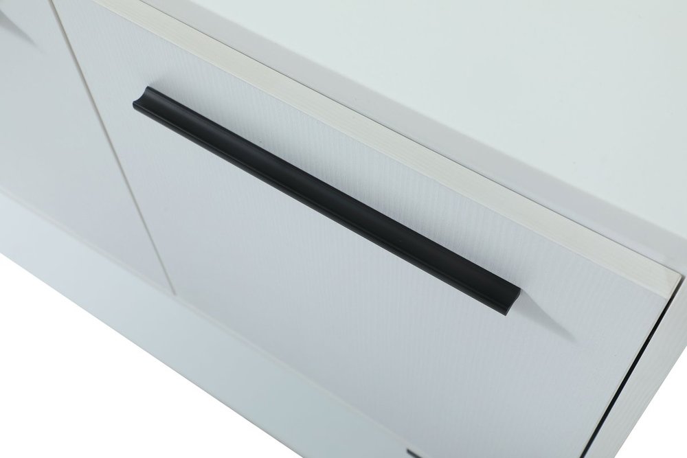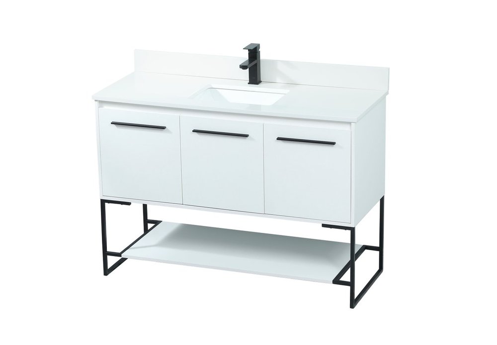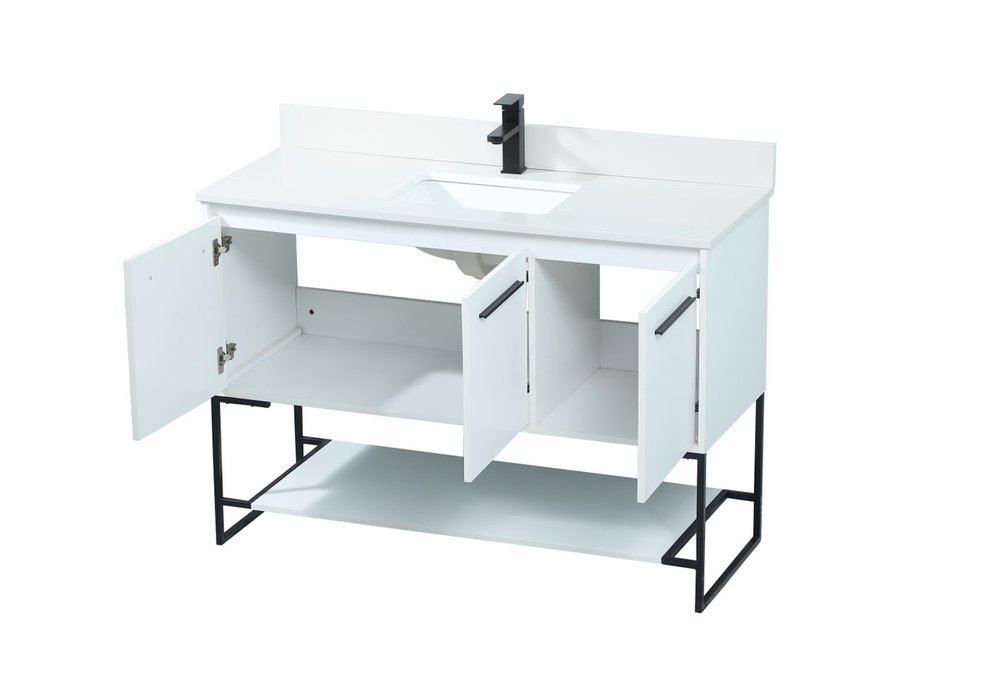 Live in modern comfort with this 48" white finish vanity. Dressed in a white and sleek black metal hardware, its contemporary style will have your bathroom or powder room elevated in industrial sophistication. The open shelf at the base and three doors reveal ample storage space for your bathroom essentials and miscellany. Clean lines create its own visual interest, adding trendy looks to your already chic room. Comes with a matching backsplash to complete the look and protects your wall.